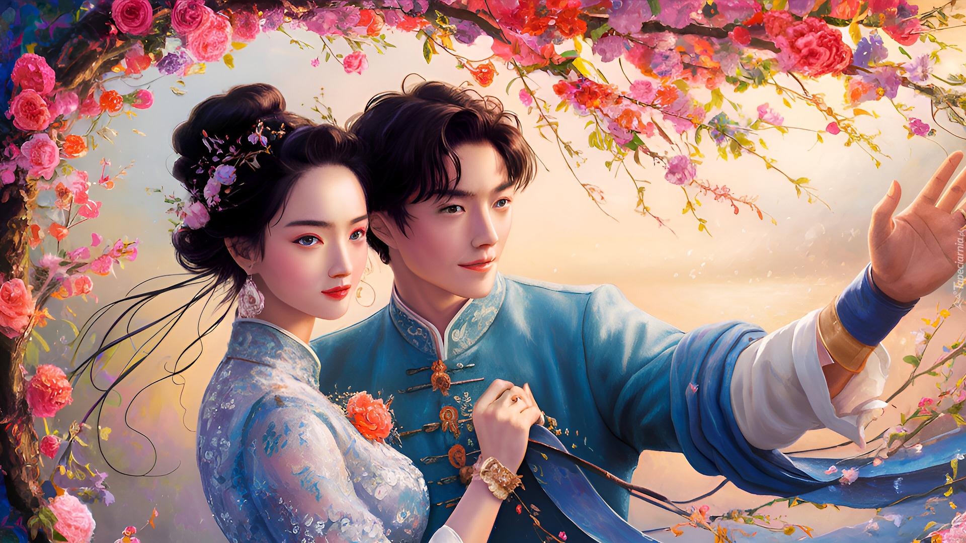 Edytor tapety: Para Azjatów pod ukwieconymi gałęziami