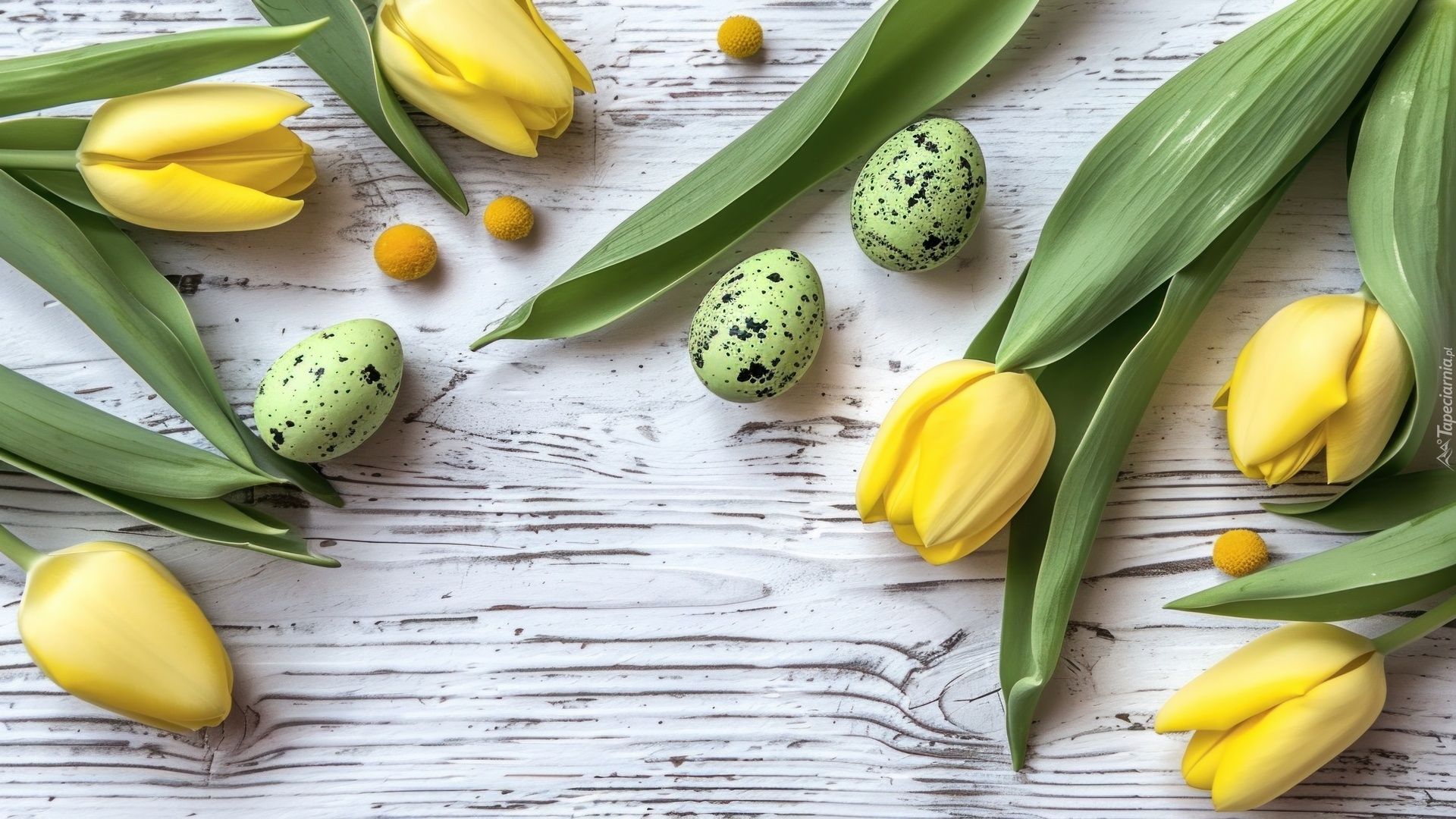 Edytor tapety: Nakrapiane pisanki i żółte tulipany na deskach