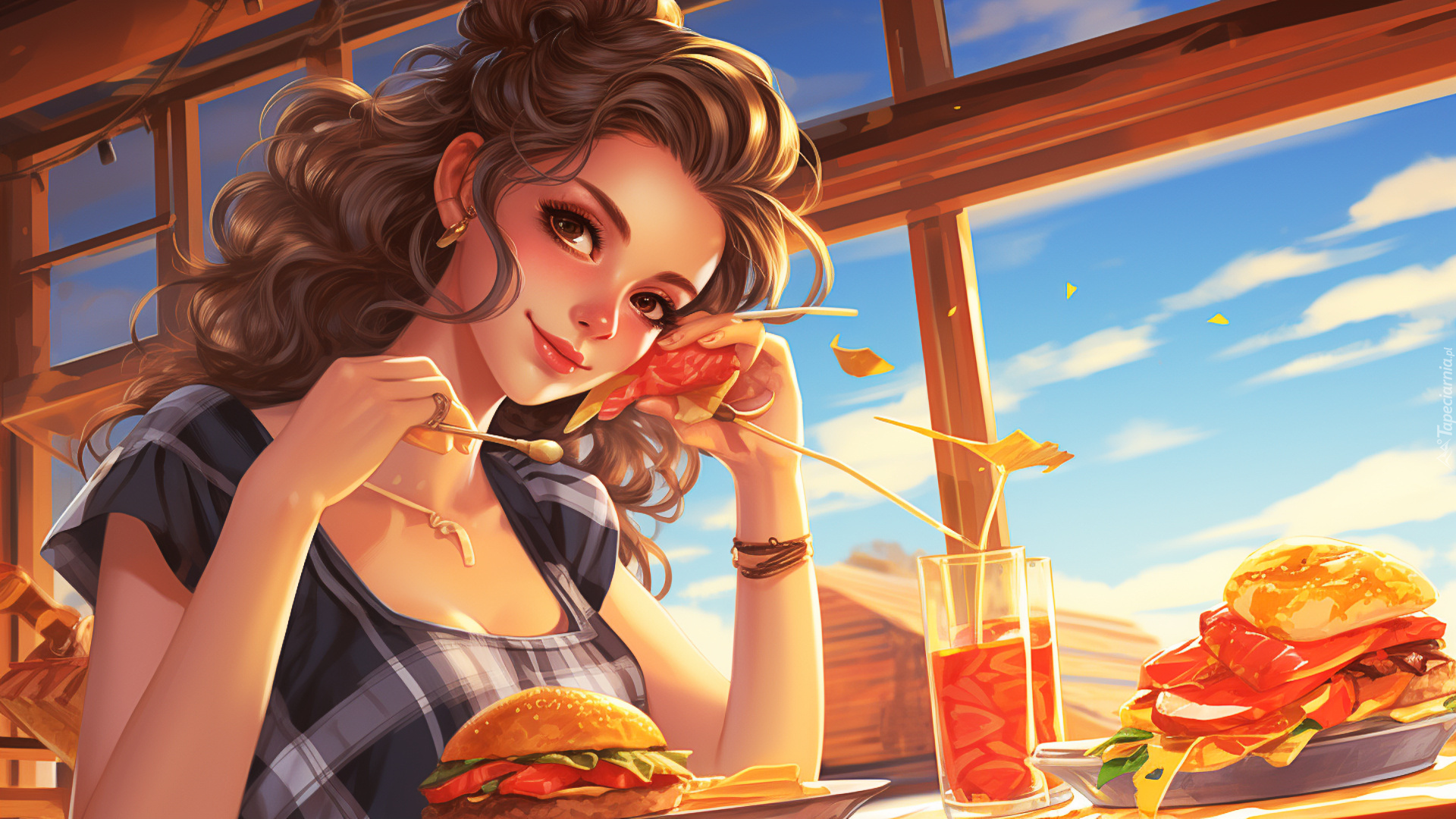 Edytor tapety: Dziewczyna siedząca przy stoliku i jedząca hamburgera