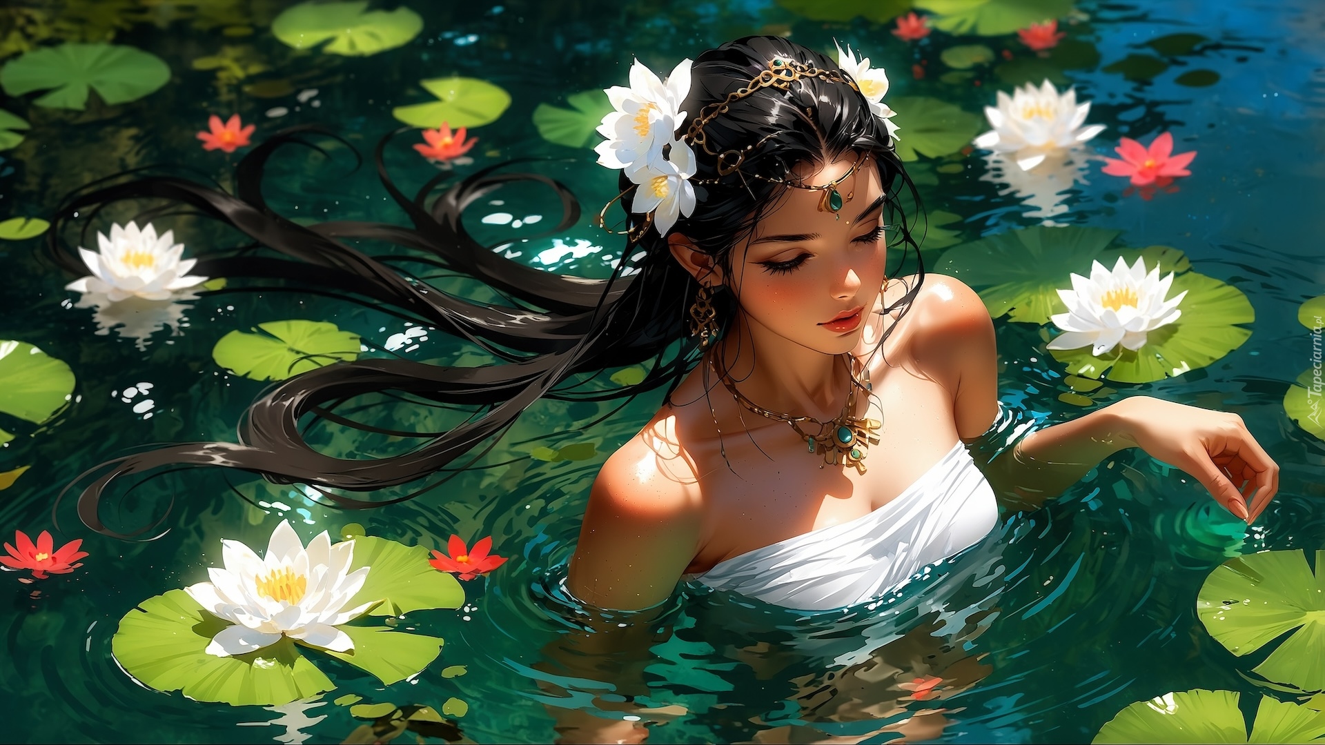 Edytor tapety: Kobieta zanurzona w wodzie wśród lilii wodnych