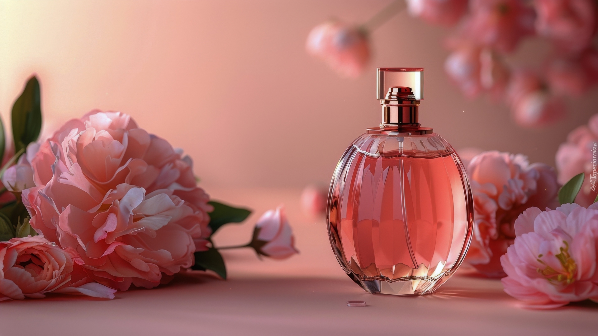 Edytor tapety: Różowe kwiaty i flakon z perfumami