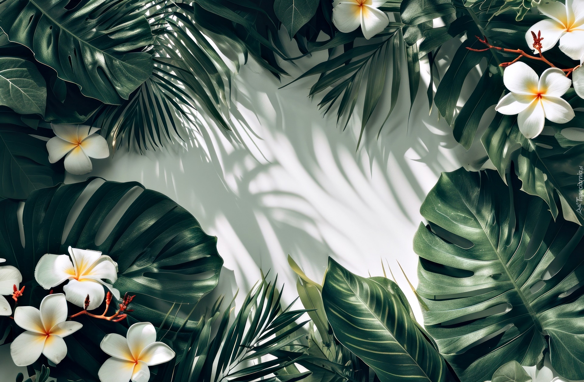 Edytor tapety: Kwiaty plumerii na zielonych liściach