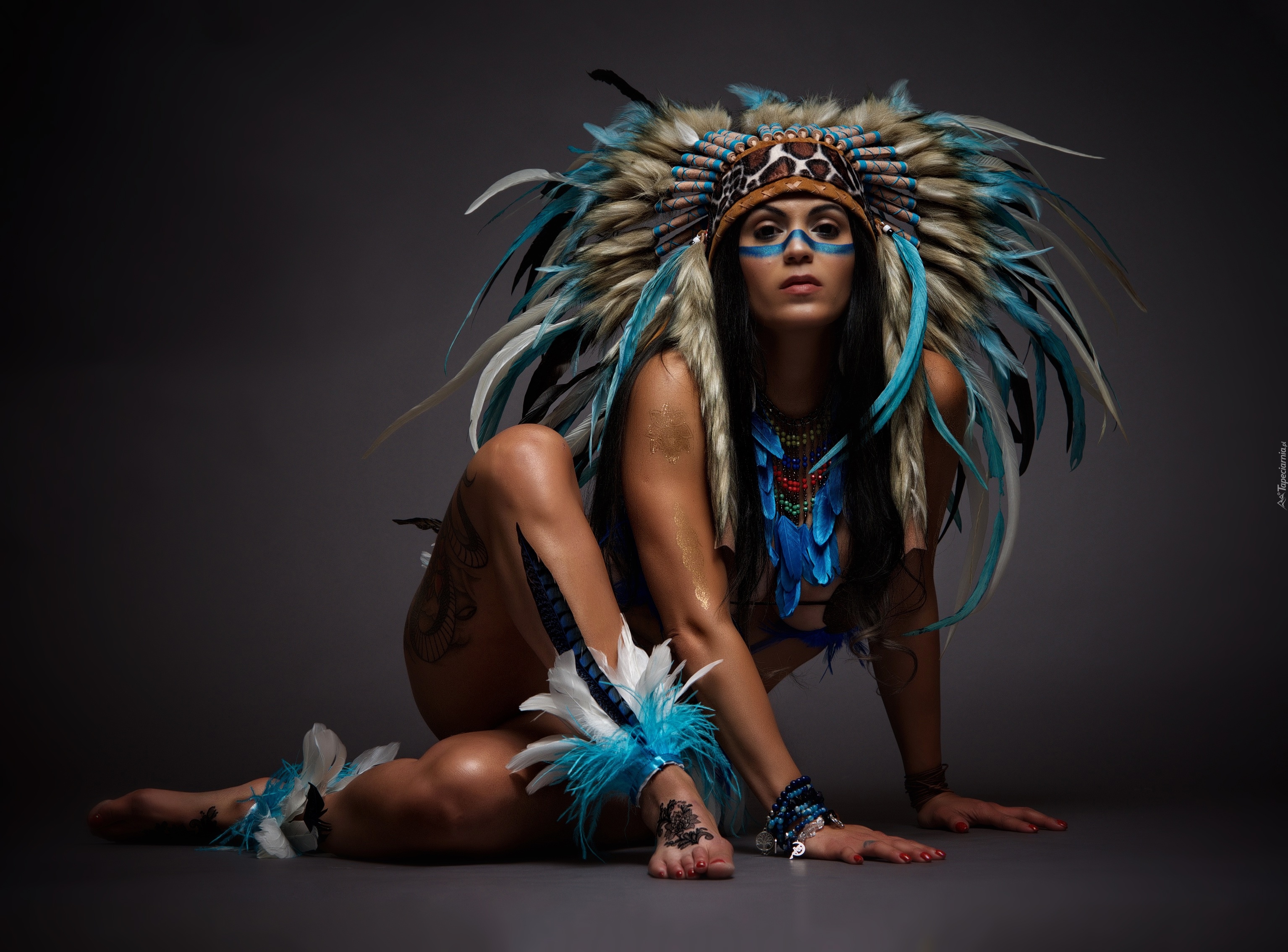 Edytor tapety: Kobieta w pióropuszu na głowie na ciemnym tle