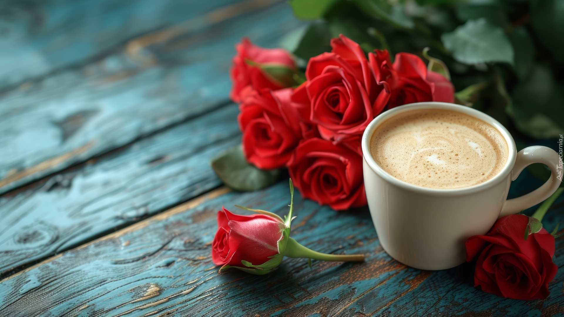 Edytor tapety: Kubek z kawą i czerwone róże na deskach