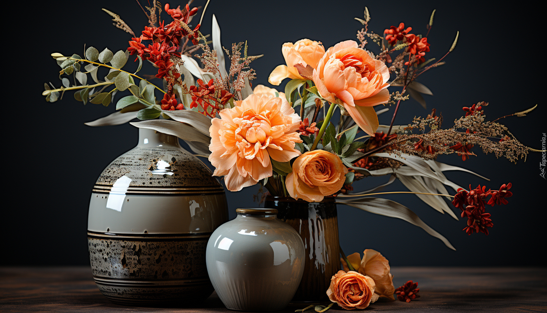 Edytor tapety: Trzy wazony i bukiet kolorowych kwiatów