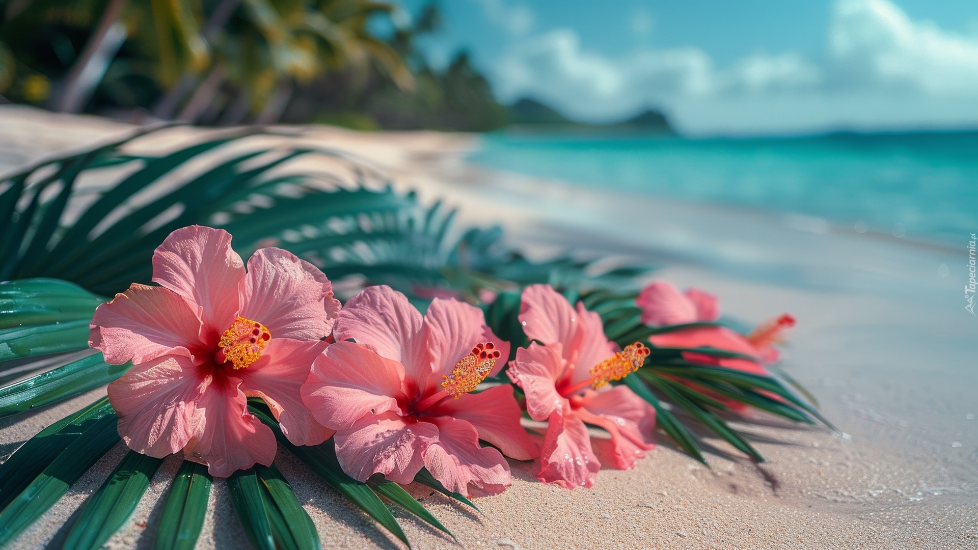 Edytor tapety: Kwiaty hibiskusa z liśćmi na plaży