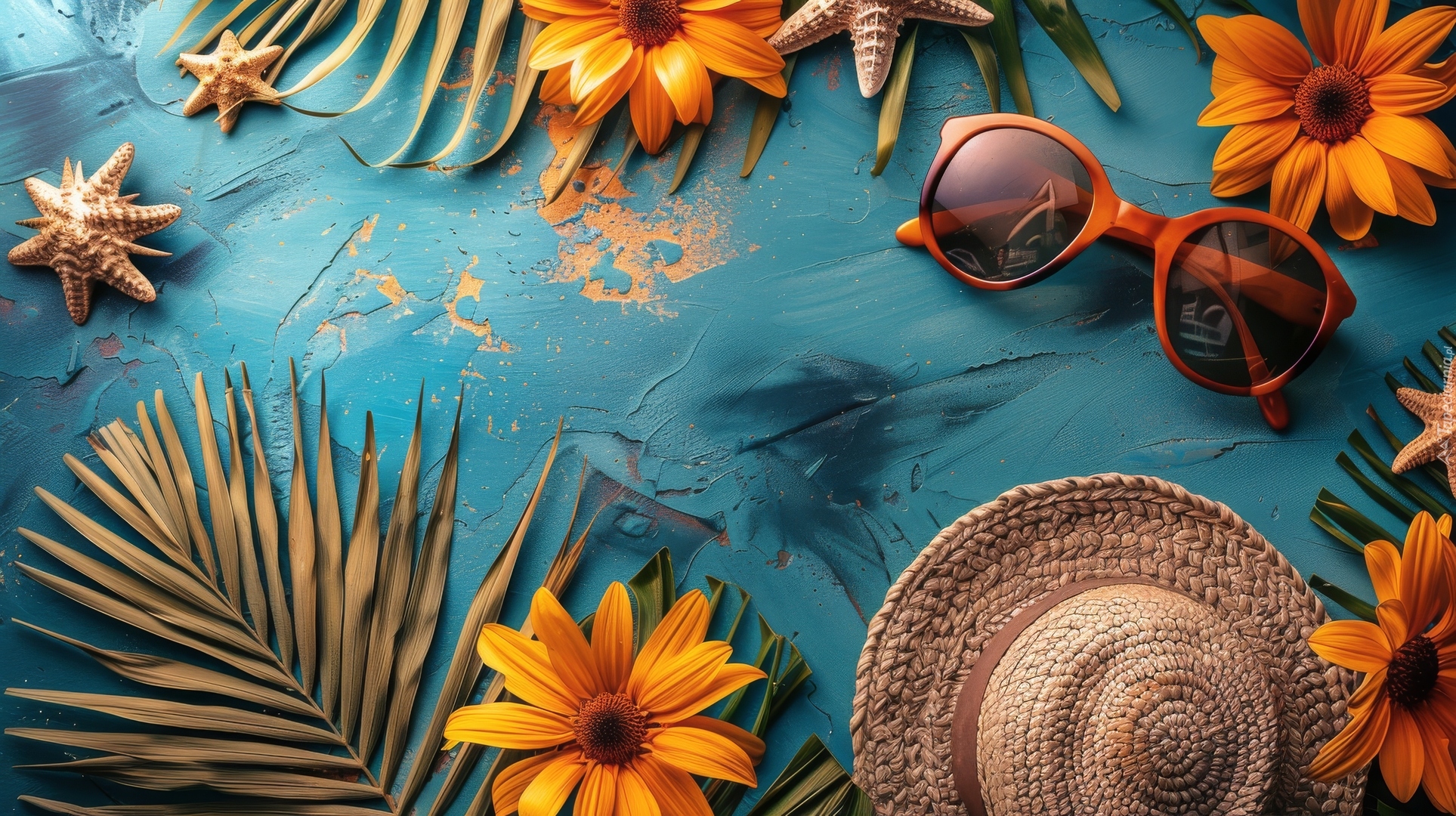 Edytor tapety: Rozgwiazdy i kwiaty obok okularów i kapelusza