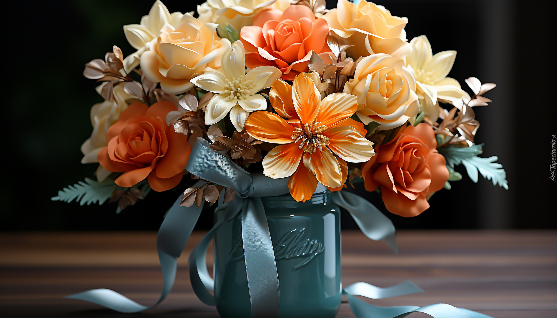 Edytor tapety: Bukiet kolorowych kwiatów ze wstążką w wazonie