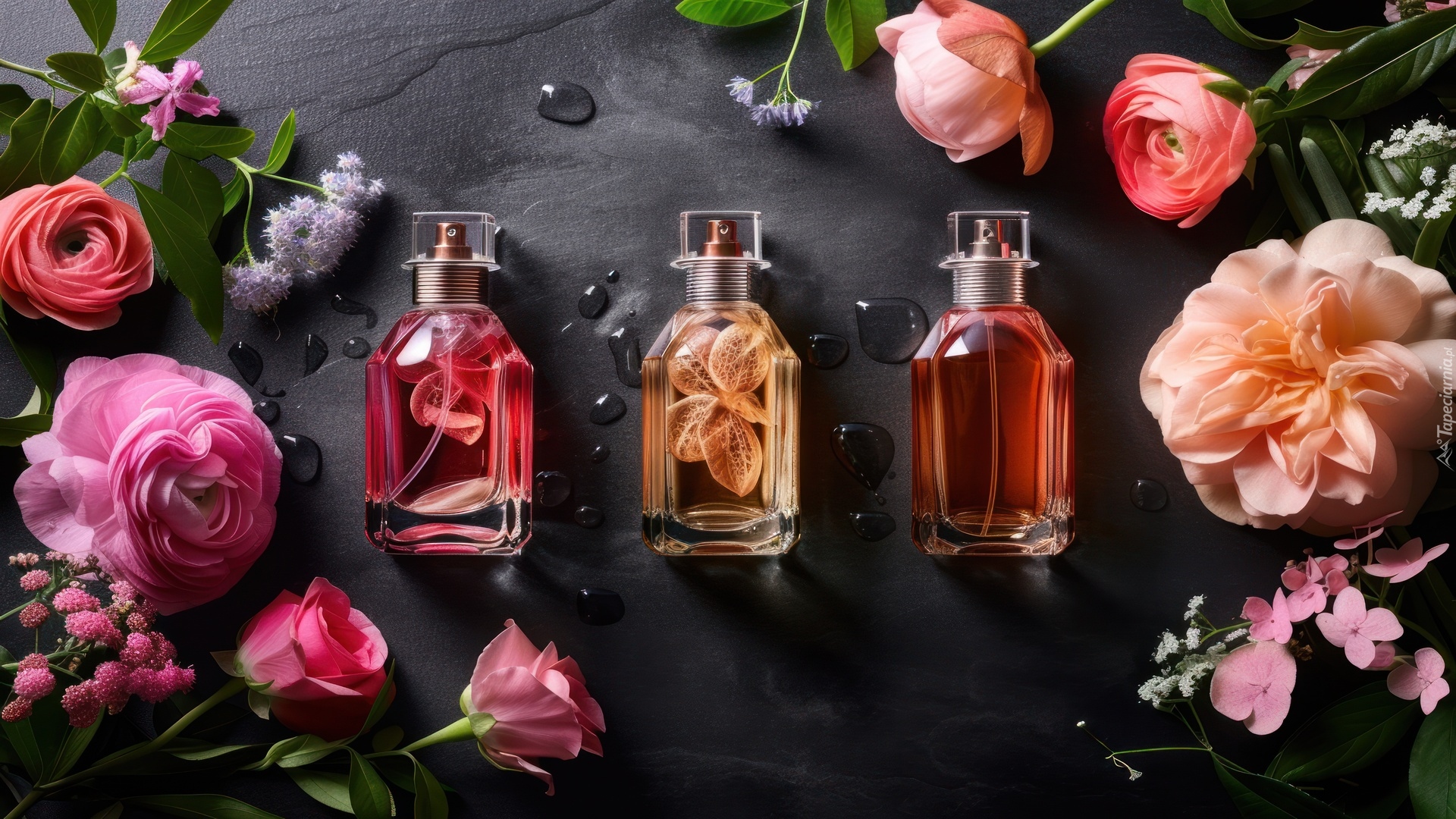 Edytor tapety: Trzy flakony perfum i kwiaty na ciemnym tle