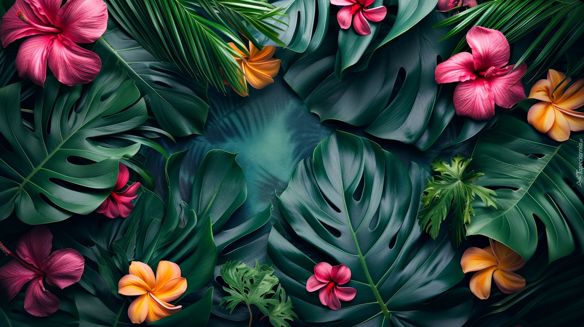 Edytor tapety: Różne kolorowe kwiaty na liściach w grafice