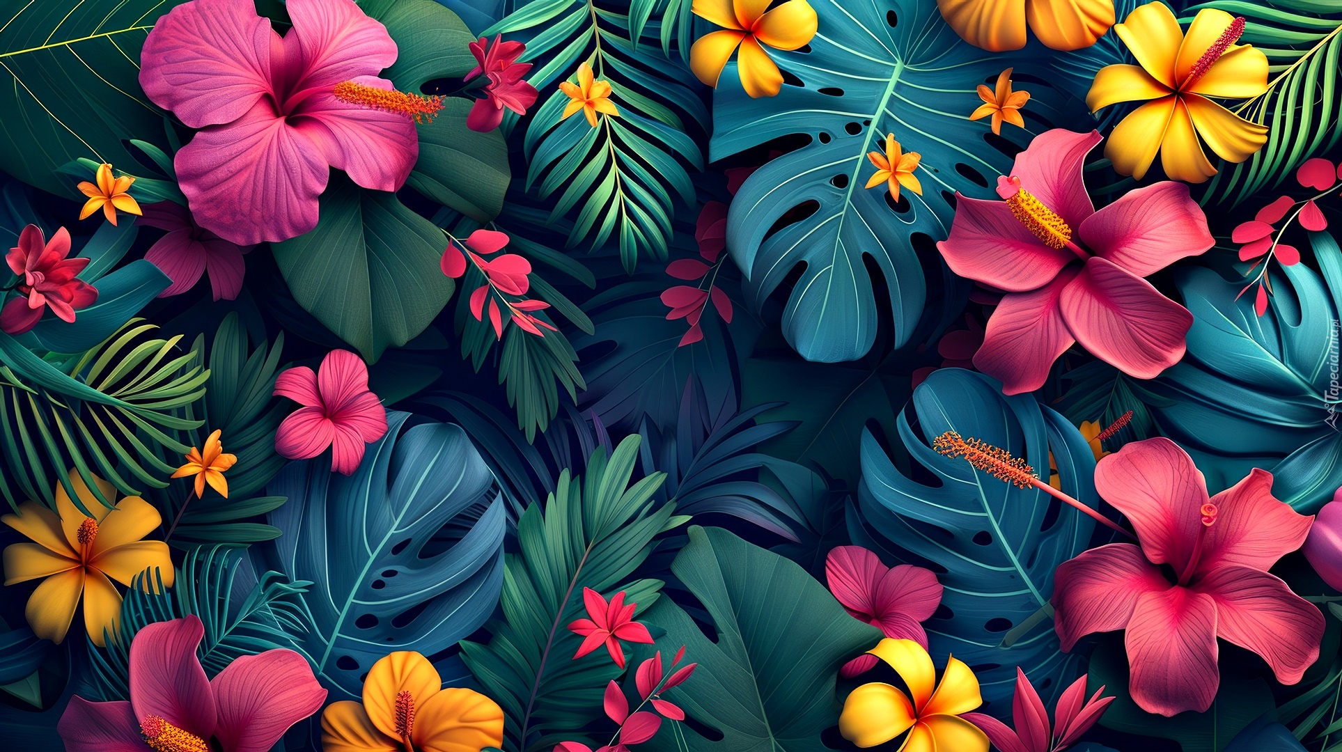 Edytor tapety: Kolorowe kwiaty plumerii i hibiskusa na liściach monstery