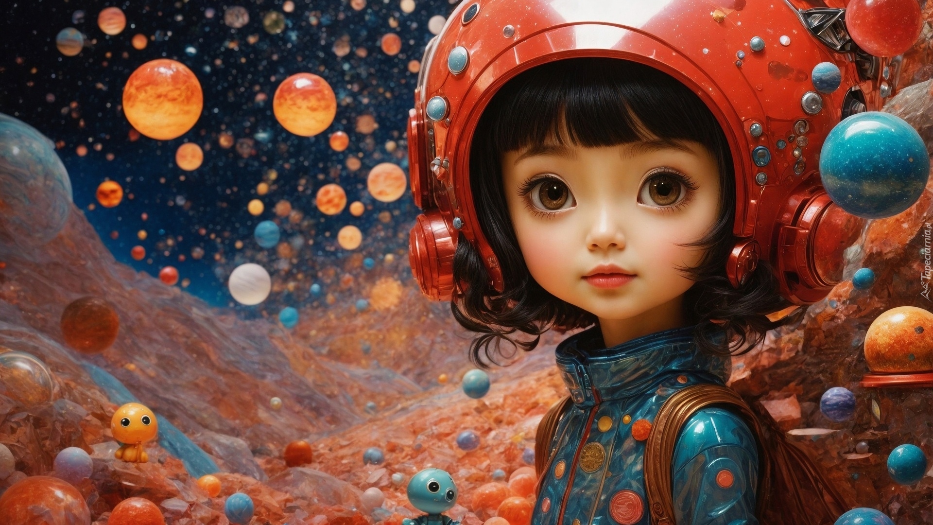 Edytor tapety: Dziewczynka w czerwonym chełmie na kolorowym tle