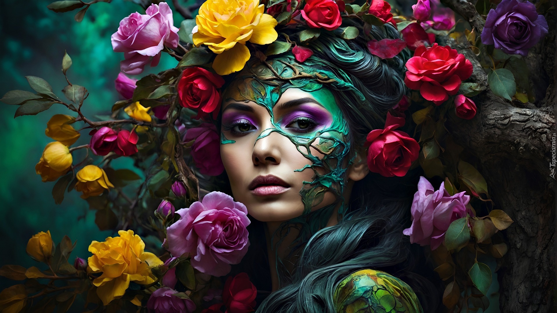 Edytor tapety: Kolorowe róże wokół głowy ciemnowłosej kobiety