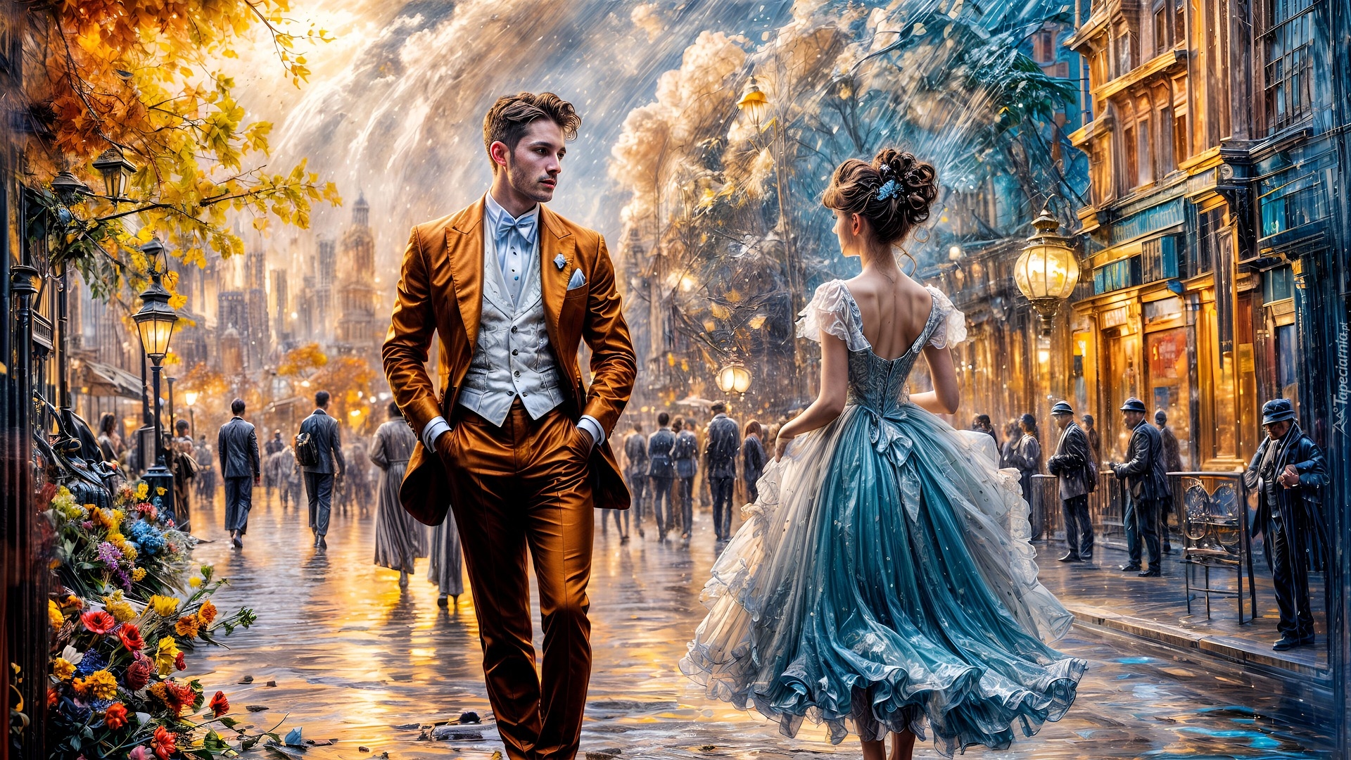 Edytor tapety: Mężczyzna i kobieta na ulicy wieczorową porą