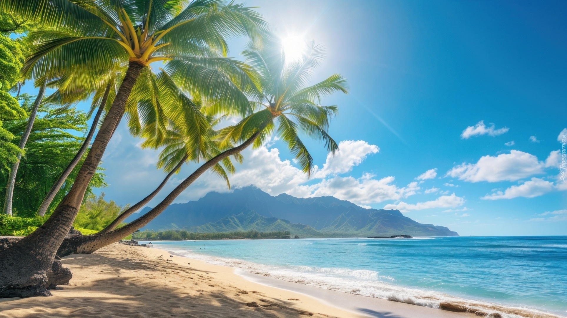 Edytor tapety: Palmy na morskiej plaży w promieniach słońca