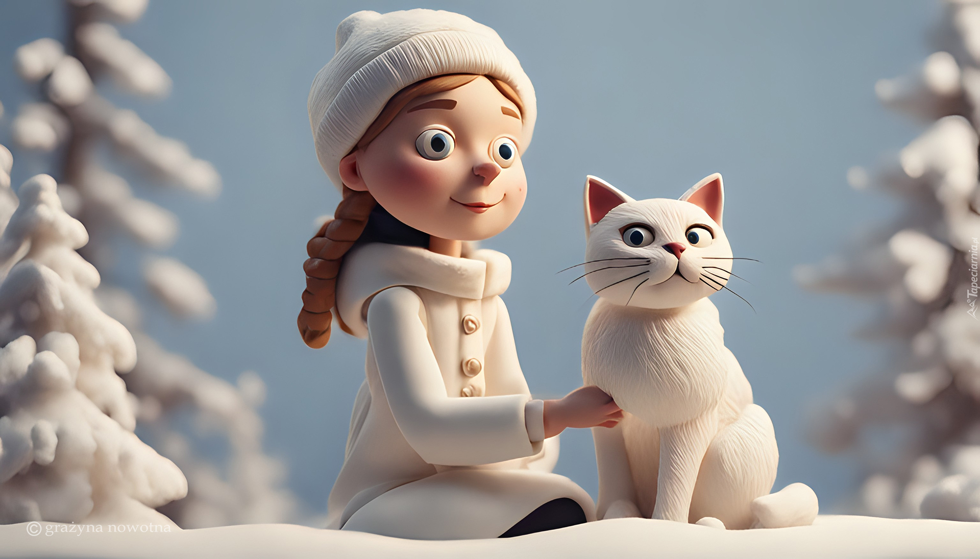 Edytor tapety: Biały kot i dziewczynka na śniegu w grafice