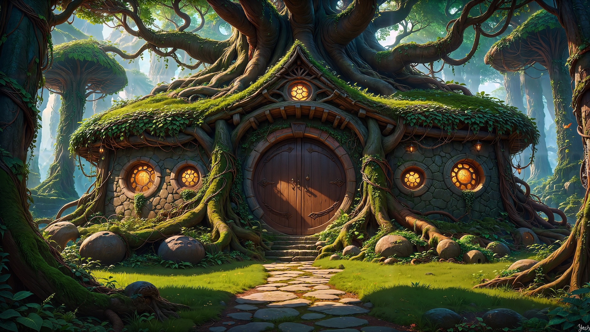 Edytor tapety: Fantazyjna chatka elfów w lesie