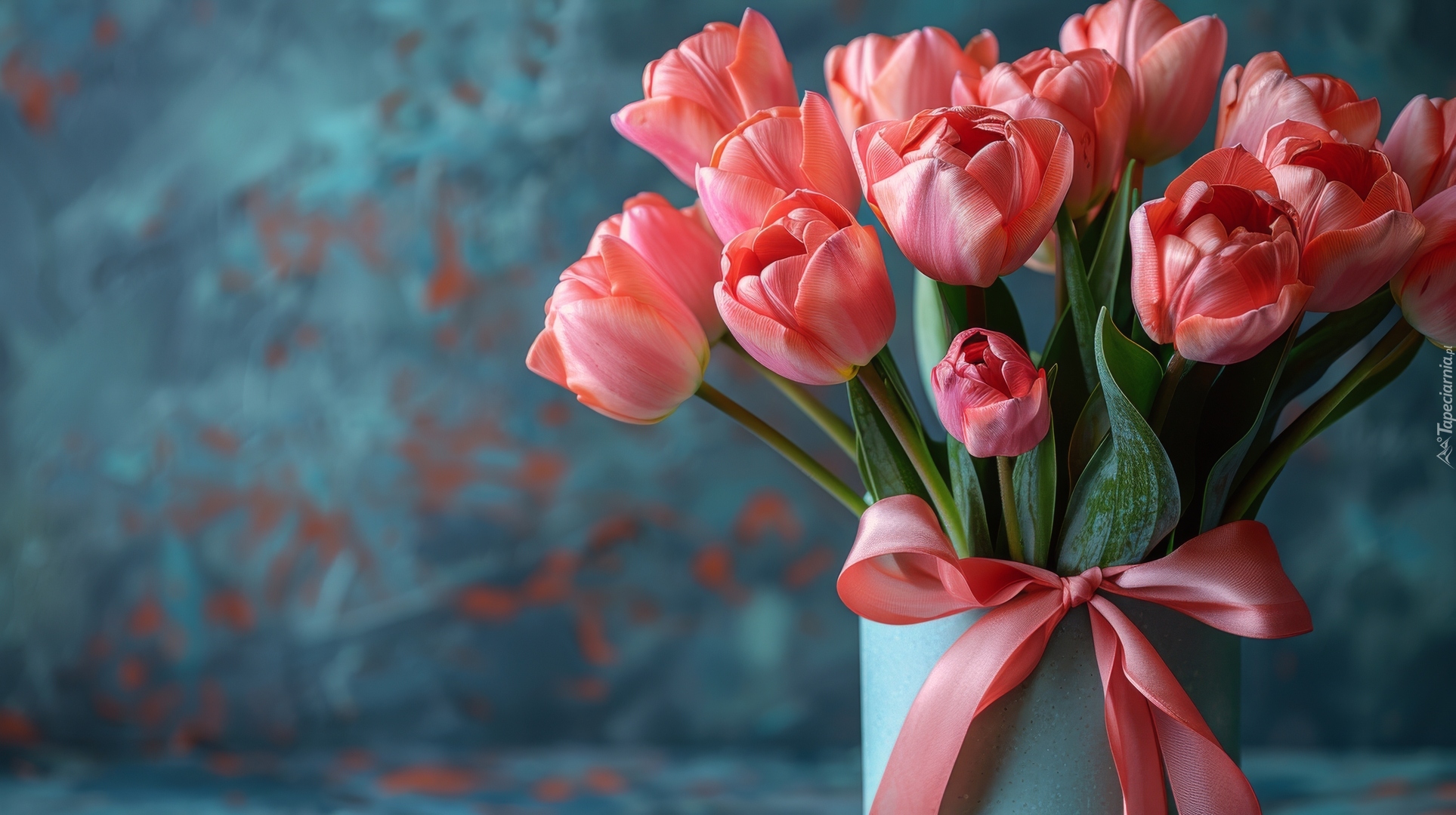 Edytor tapety: Różowe tulipany z różową kokardką w wazonie