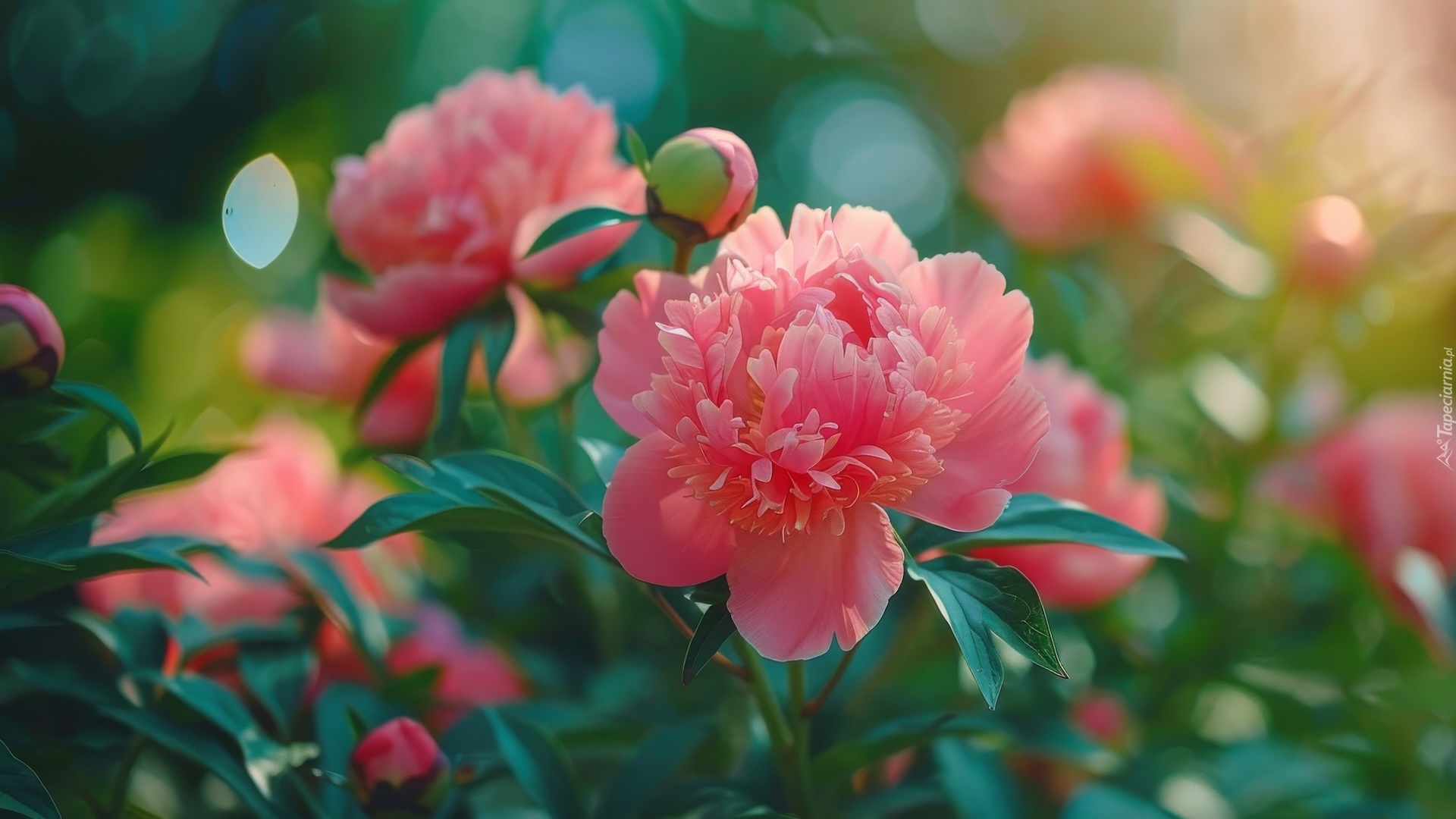 Edytor tapety: Różowe piwonie z pąkami na rozmytym tle
