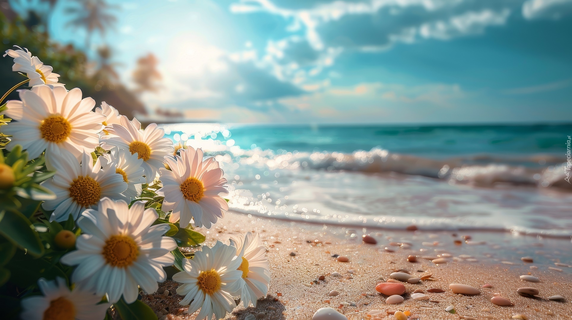 Edytor tapety: Białe kwiaty i kamyki na morskiej plaży
