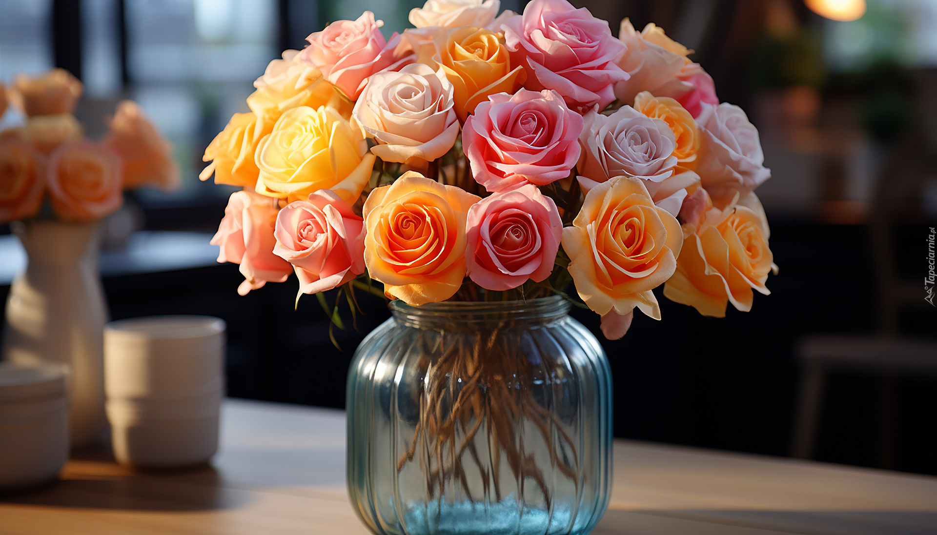 Edytor tapety: Kolorowe róże i wazon w blasku światła