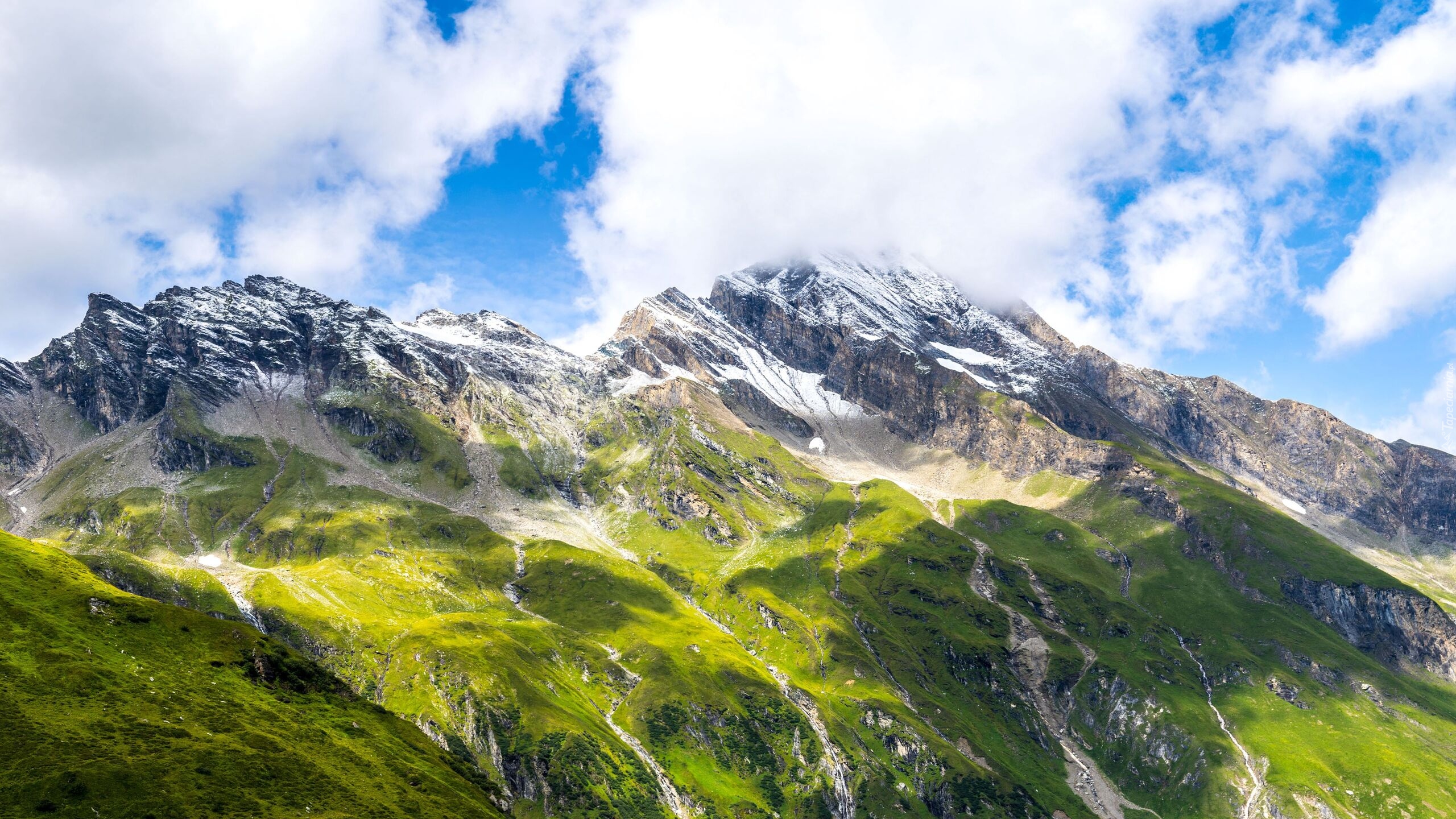 Edytor tapety: Białe chmury nad ośnieżonymi szczytami gór