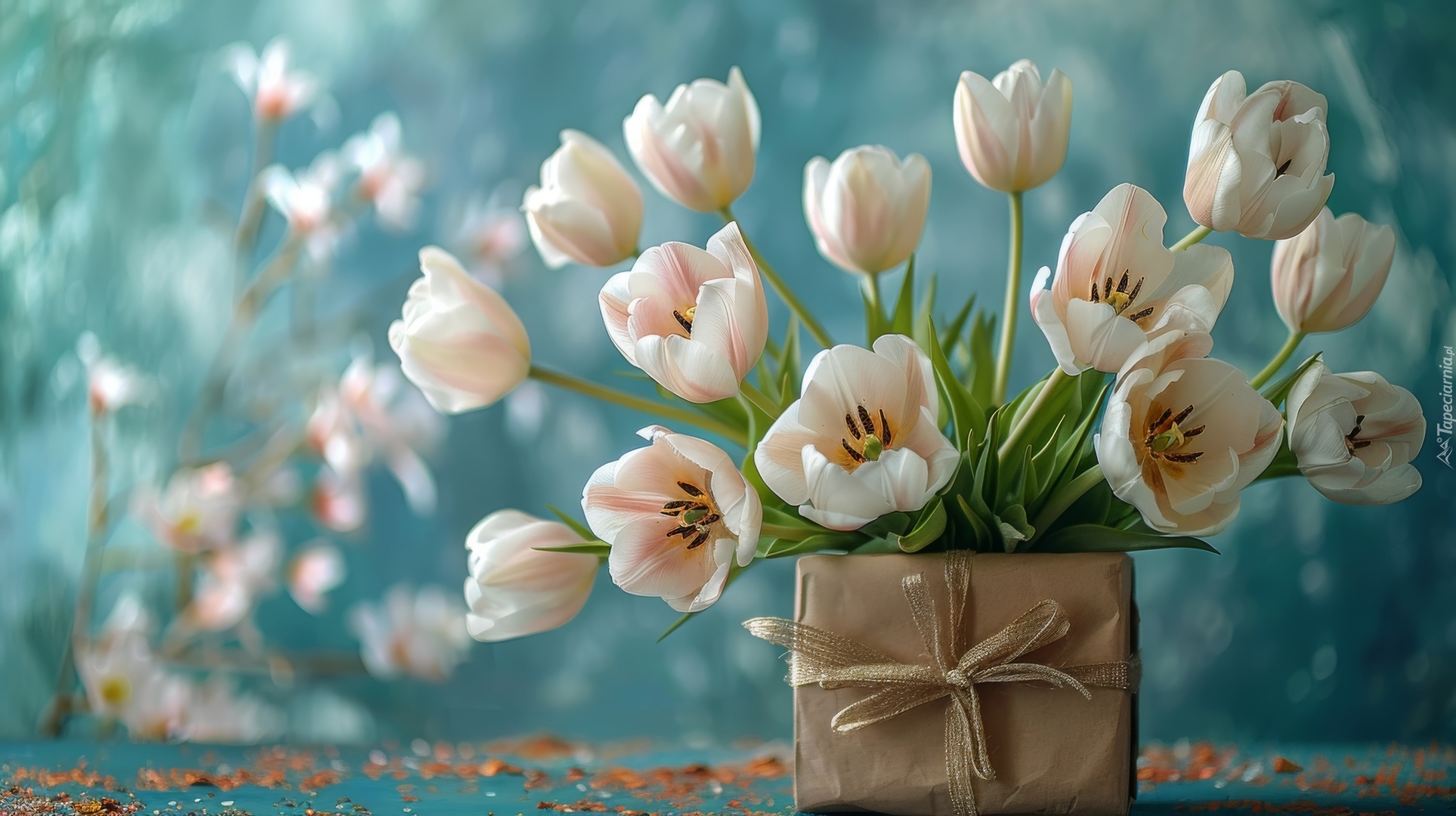 Edytor tapety: Bukiet białych tulipanów na prezencie