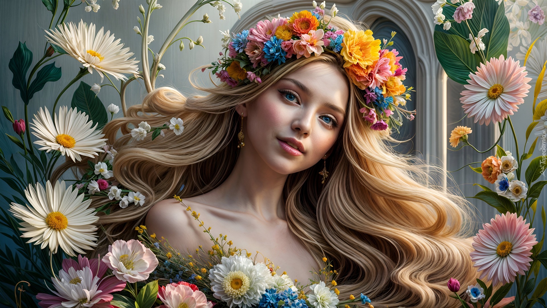 Edytor tapety: Długowłosa blondynka z wiankiem na głowie wśród kwiatów