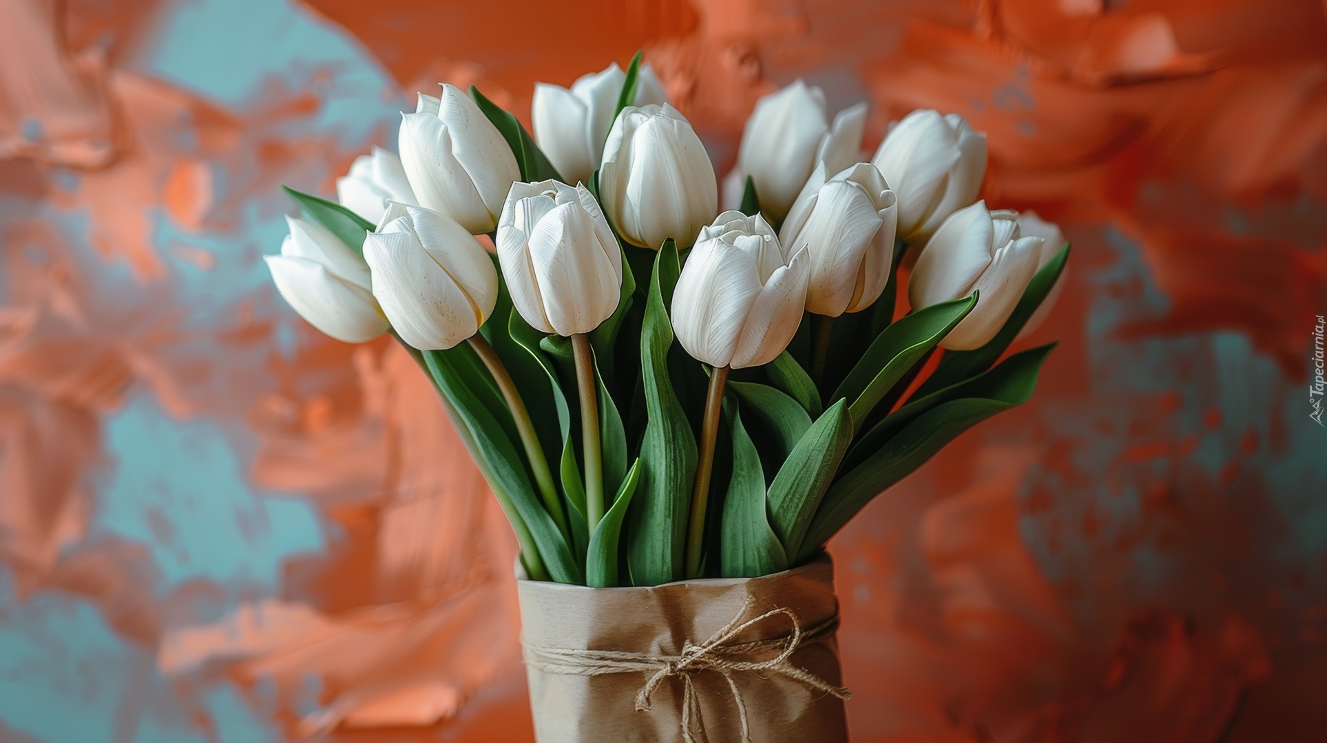 Edytor tapety: Bukiet białych tulipanów w szarym papierze