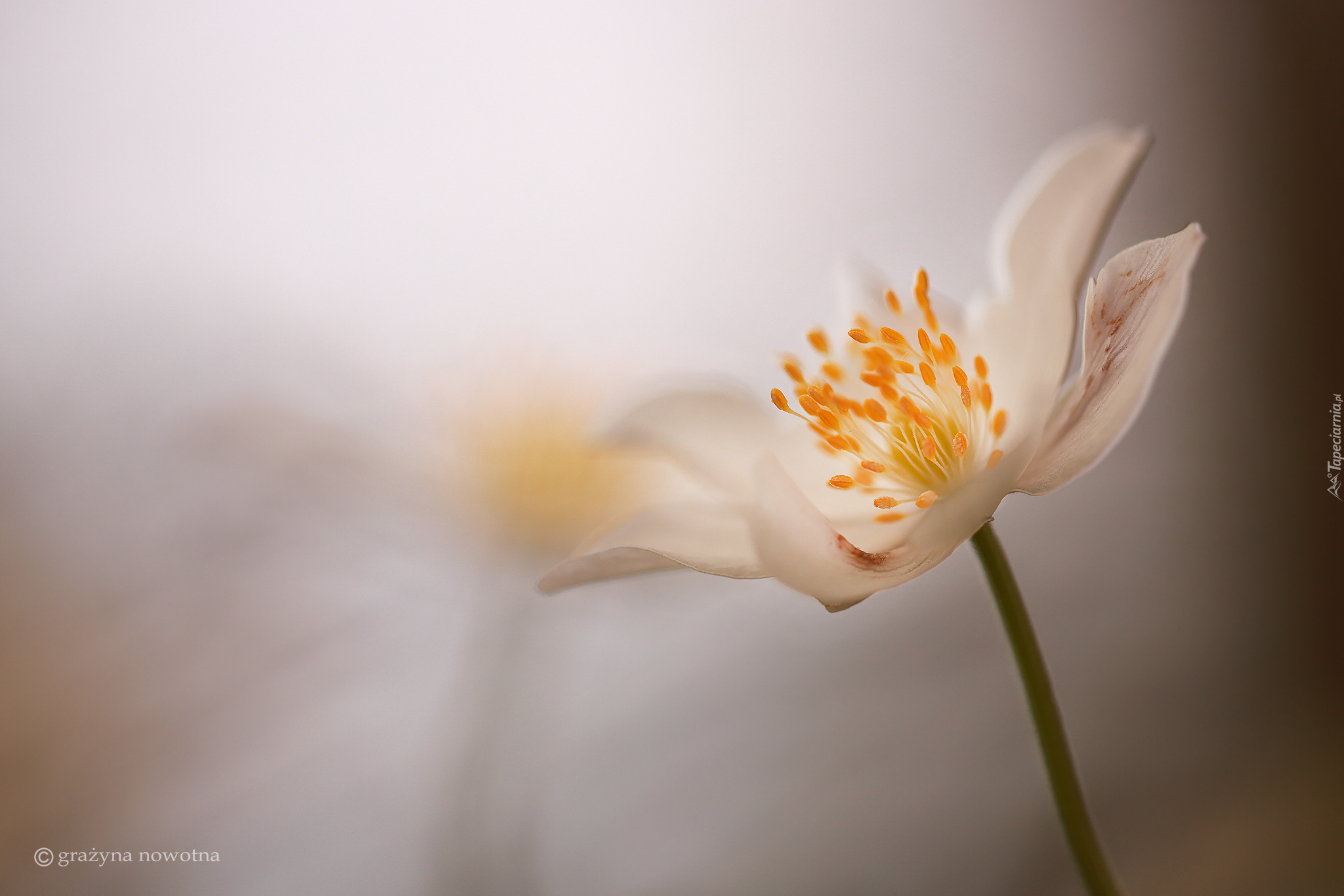 Edytor tapety: Rozwinięty biały zawilec wielkokwiatowy na rozmytym tle