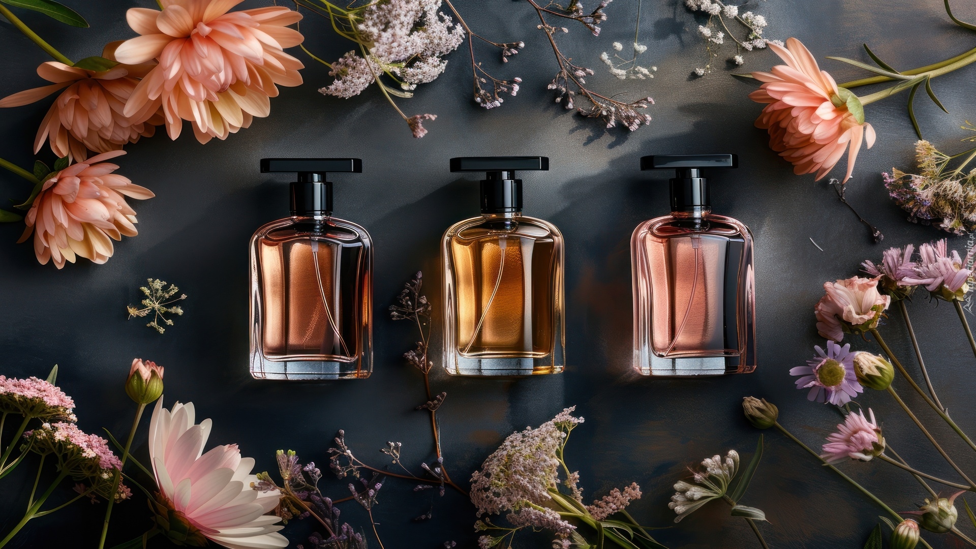 Edytor tapety: Trzy flakony perfum pośród kwiatów