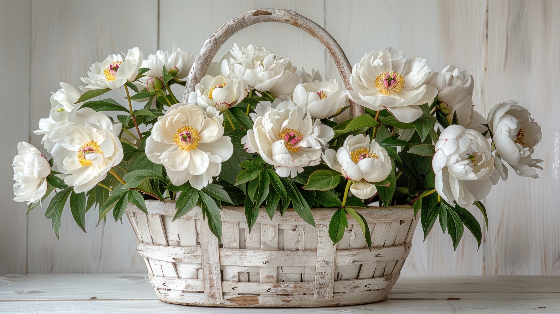 Edytor tapety: Białe piwonie w białym koszyku