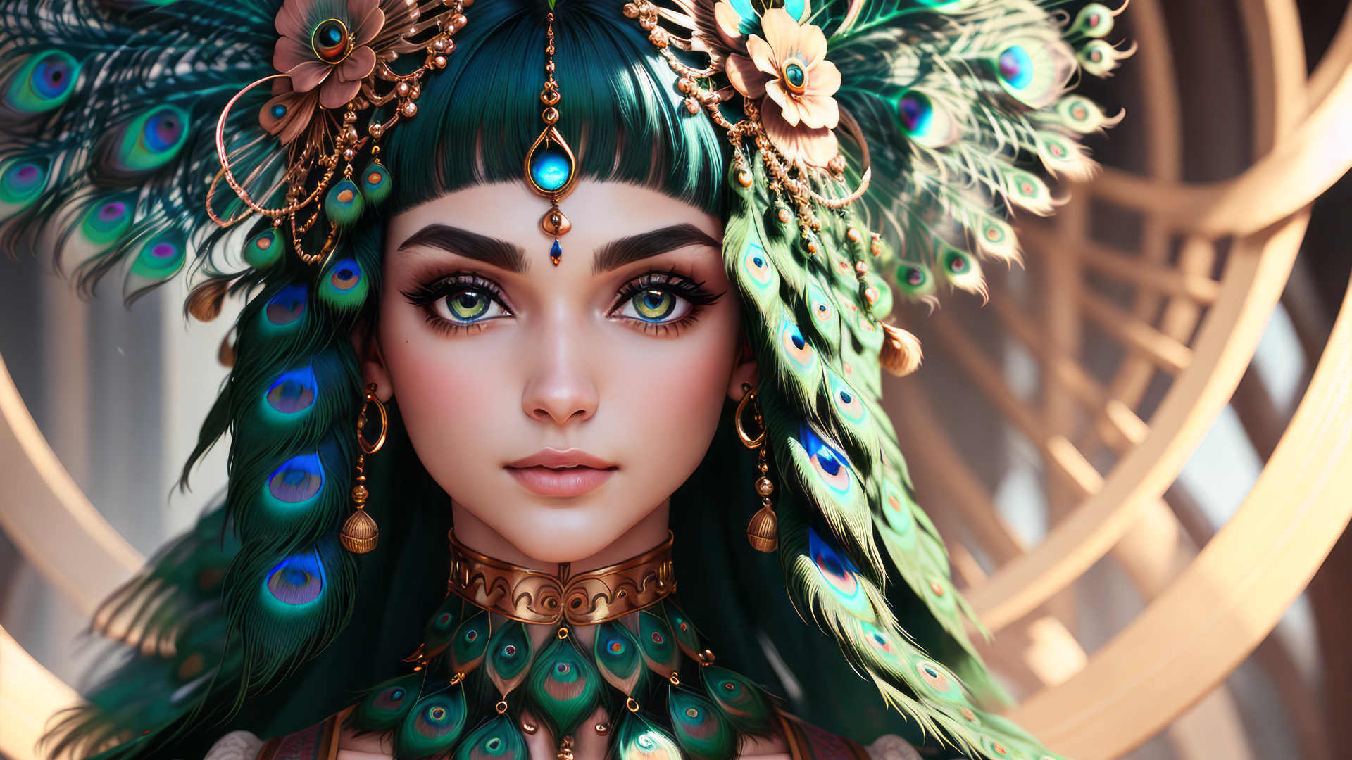 Edytor tapety: Twarz zielonookiej dziewczyny w pióropuszu