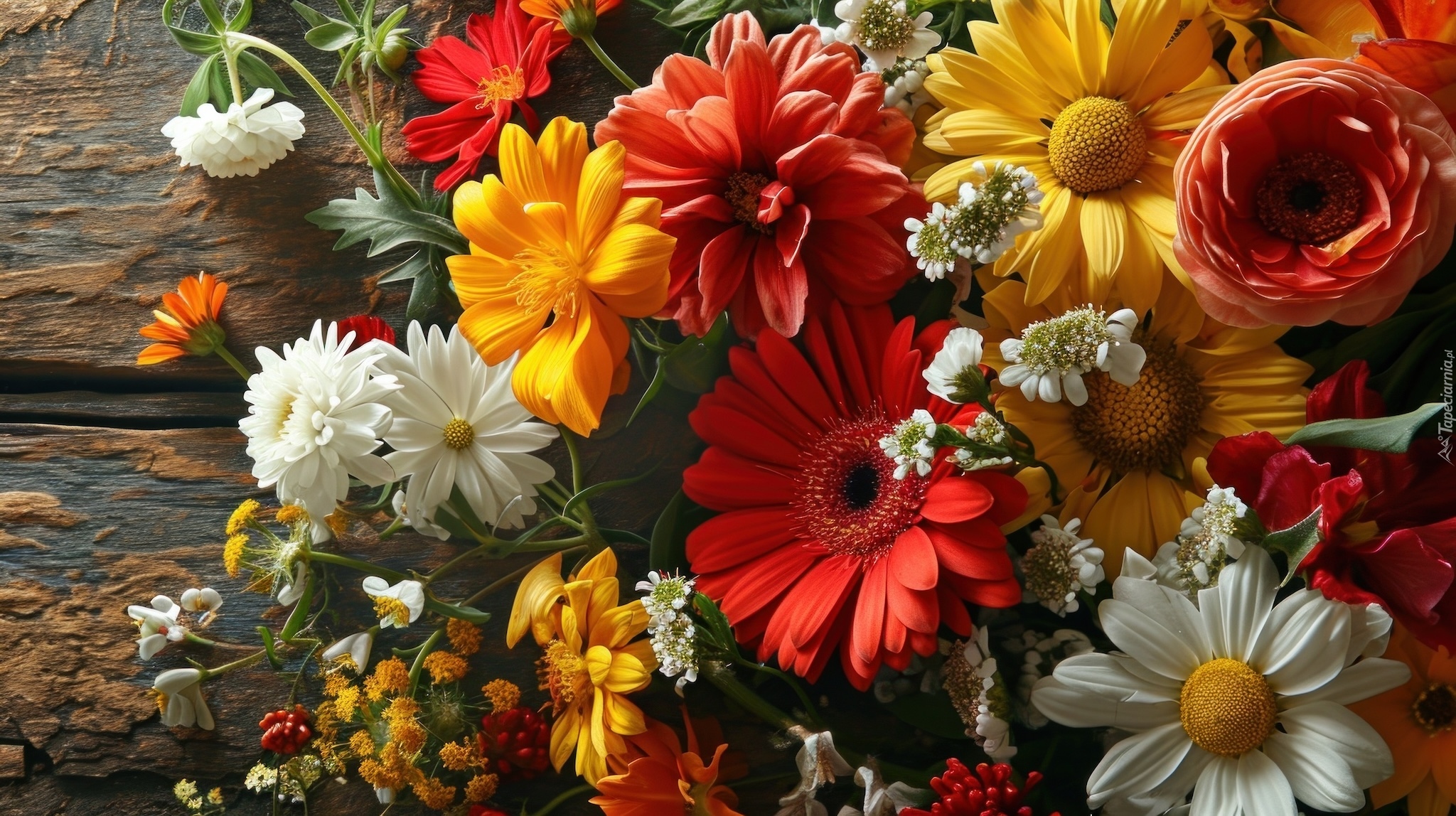 Edytor tapety: Różnokolorowe kwiatki i gerbery na deskach