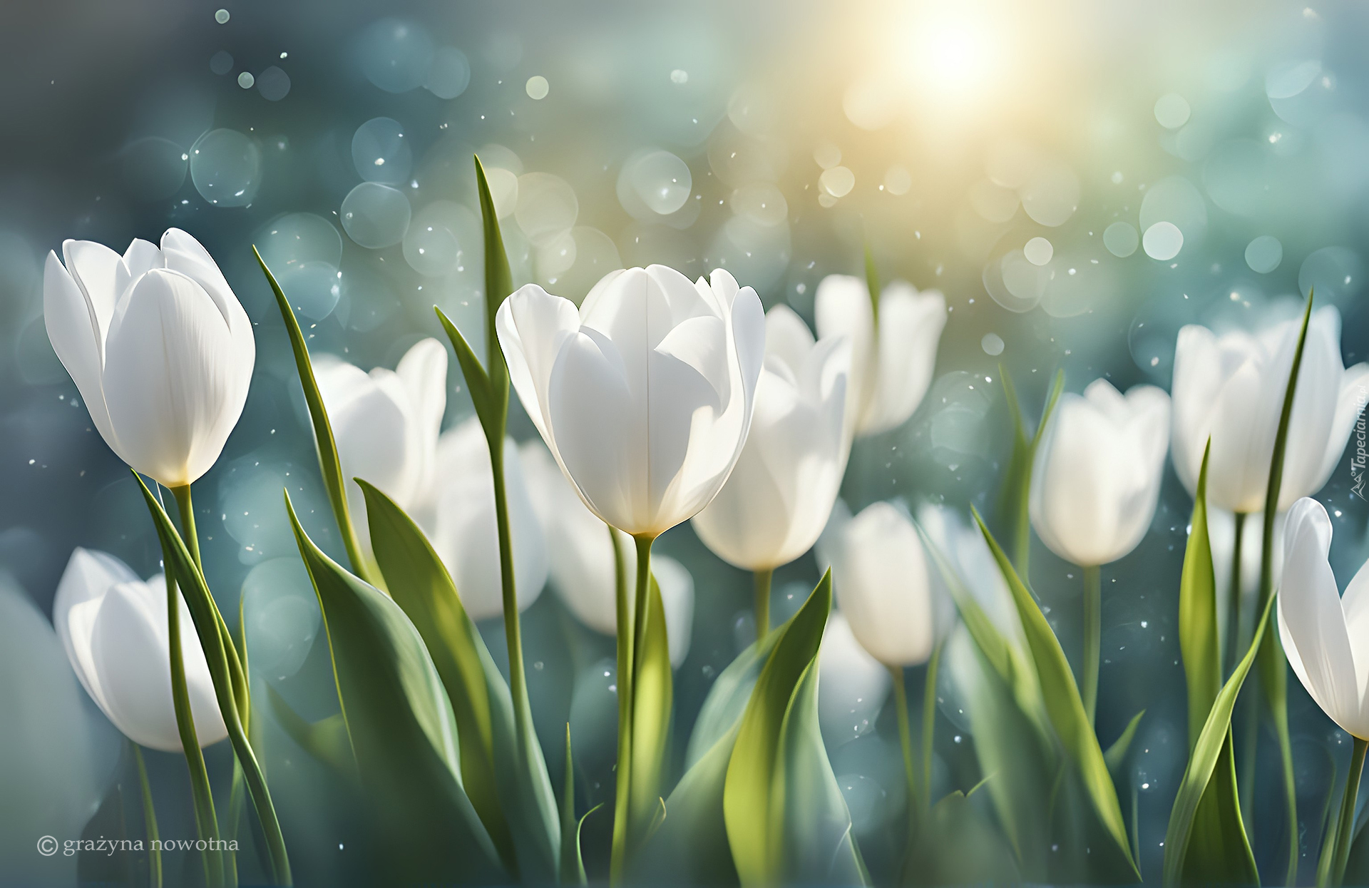 Edytor tapety: Rozświetlone białe tulipany na rozmytym tle
