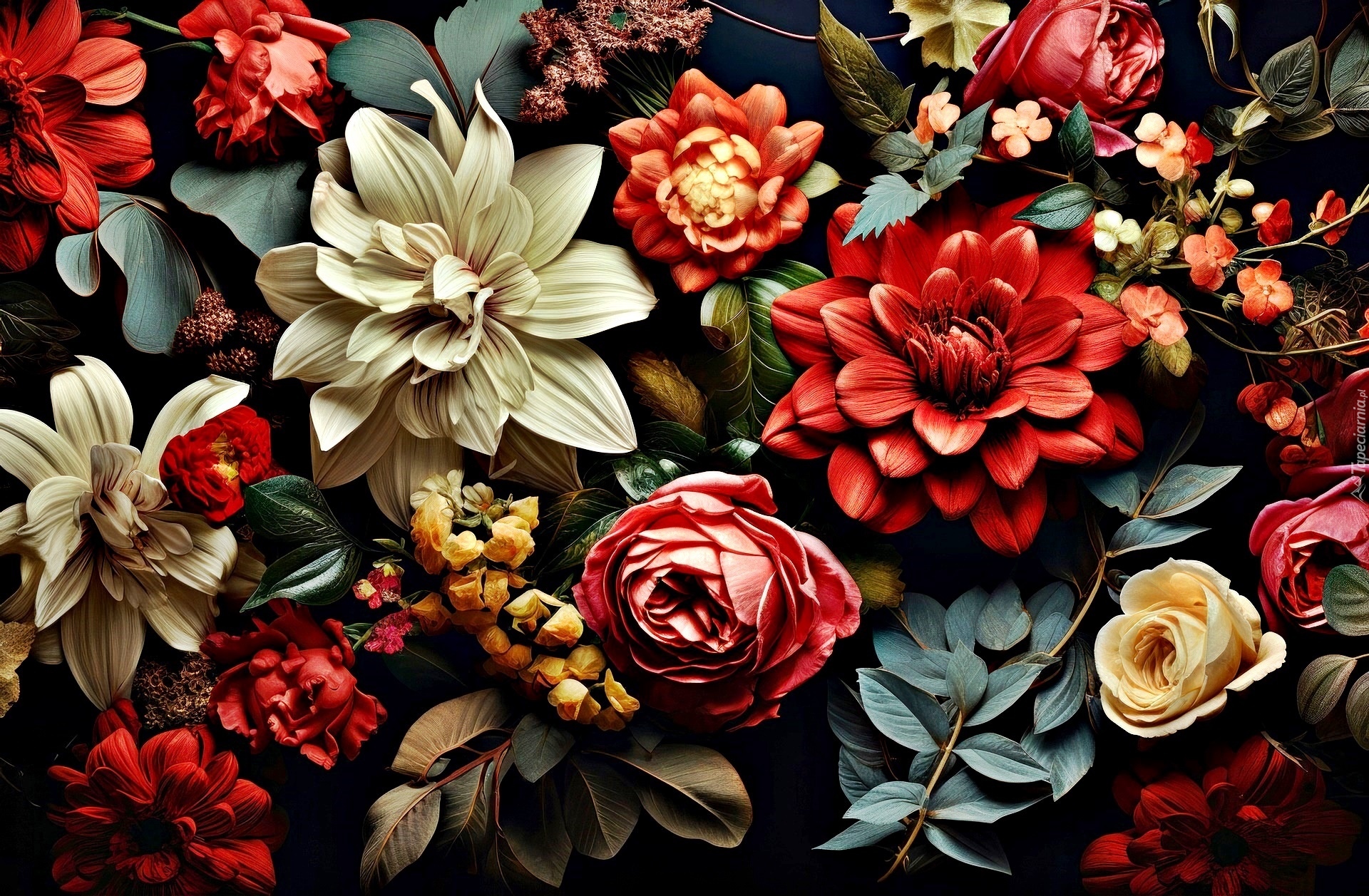 Edytor tapety: Różnorodne i kolorowe kwiaty na czarnym tle
