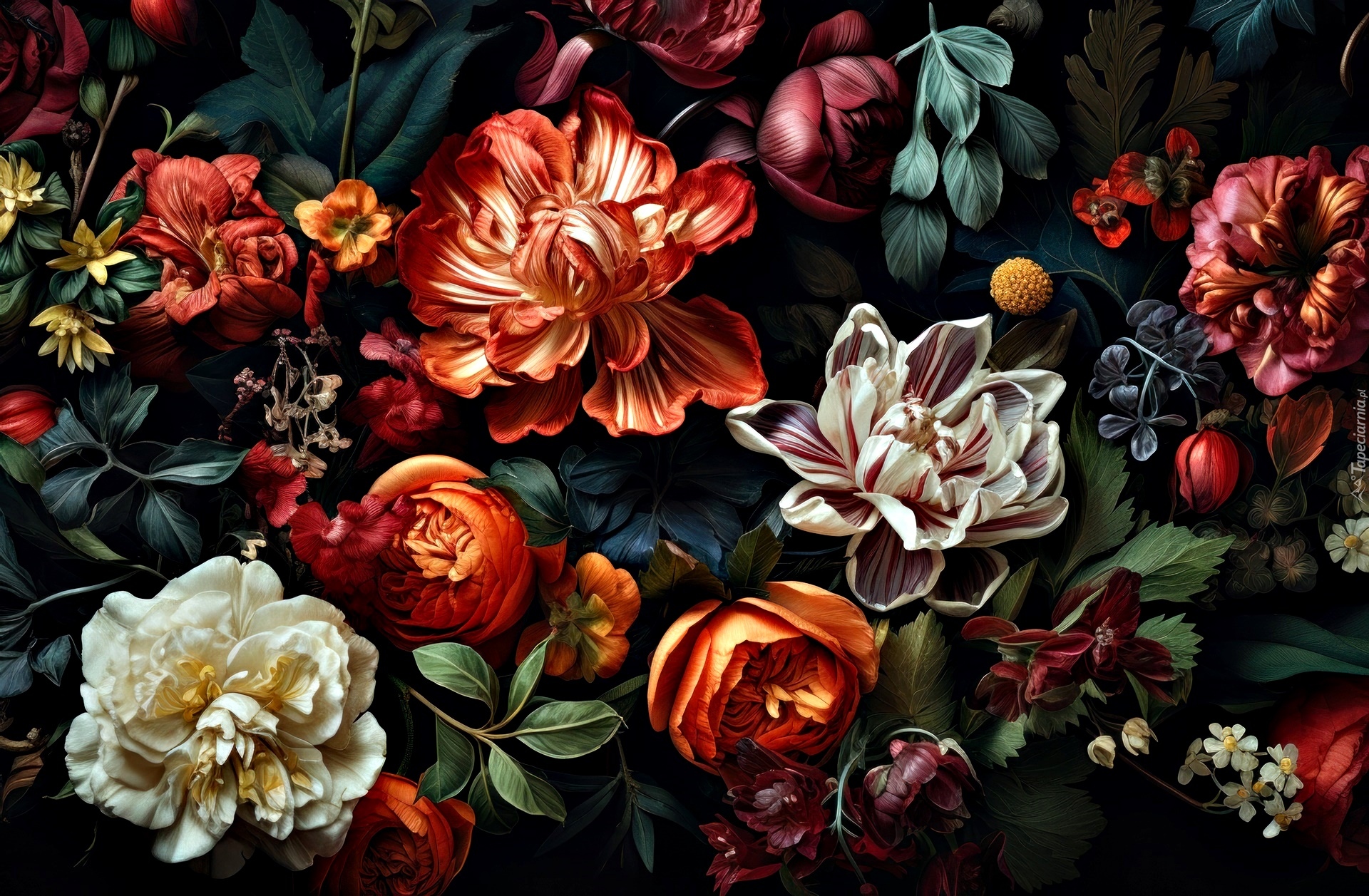 Edytor tapety: Różne kolorowe kwiaty i liście w grafice