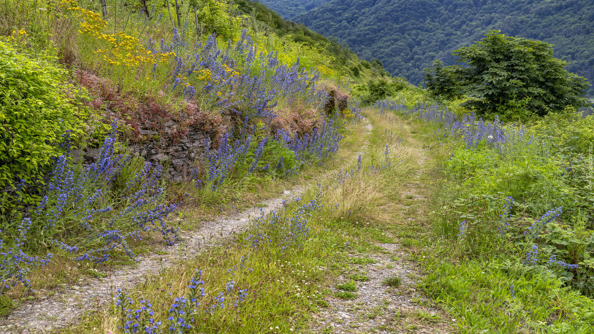Edytor tapety: Droga przez łąkę na wzgórzu