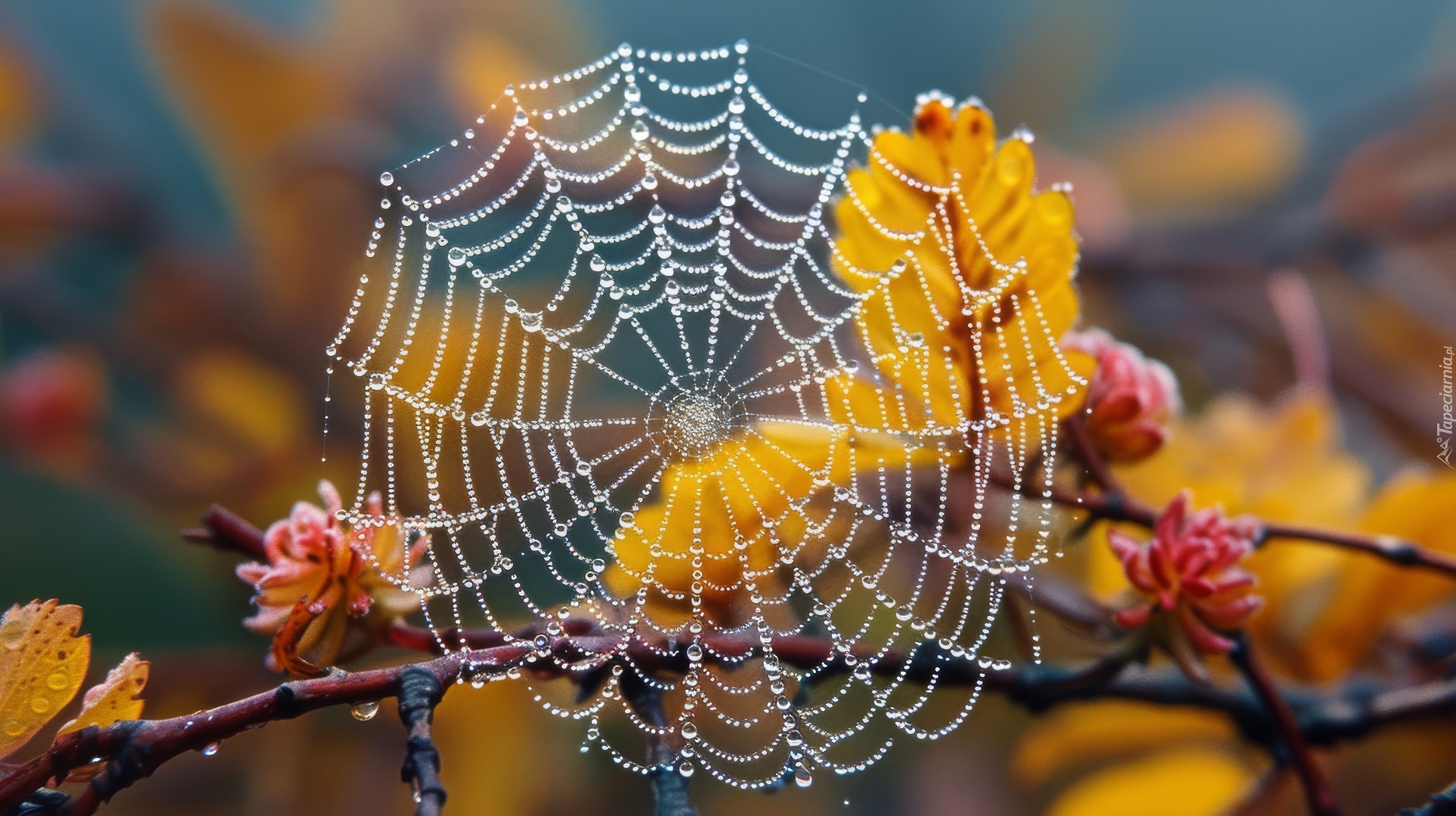 Edytor tapety: Pajęczyna i ukwiecona gałązka z kroplami wody