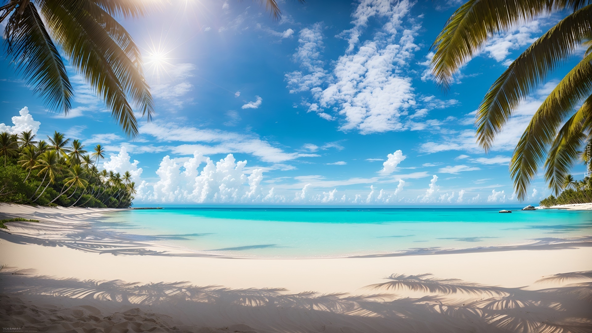 Edytor tapety: Palmy nad plażą i morze w blasku słońca