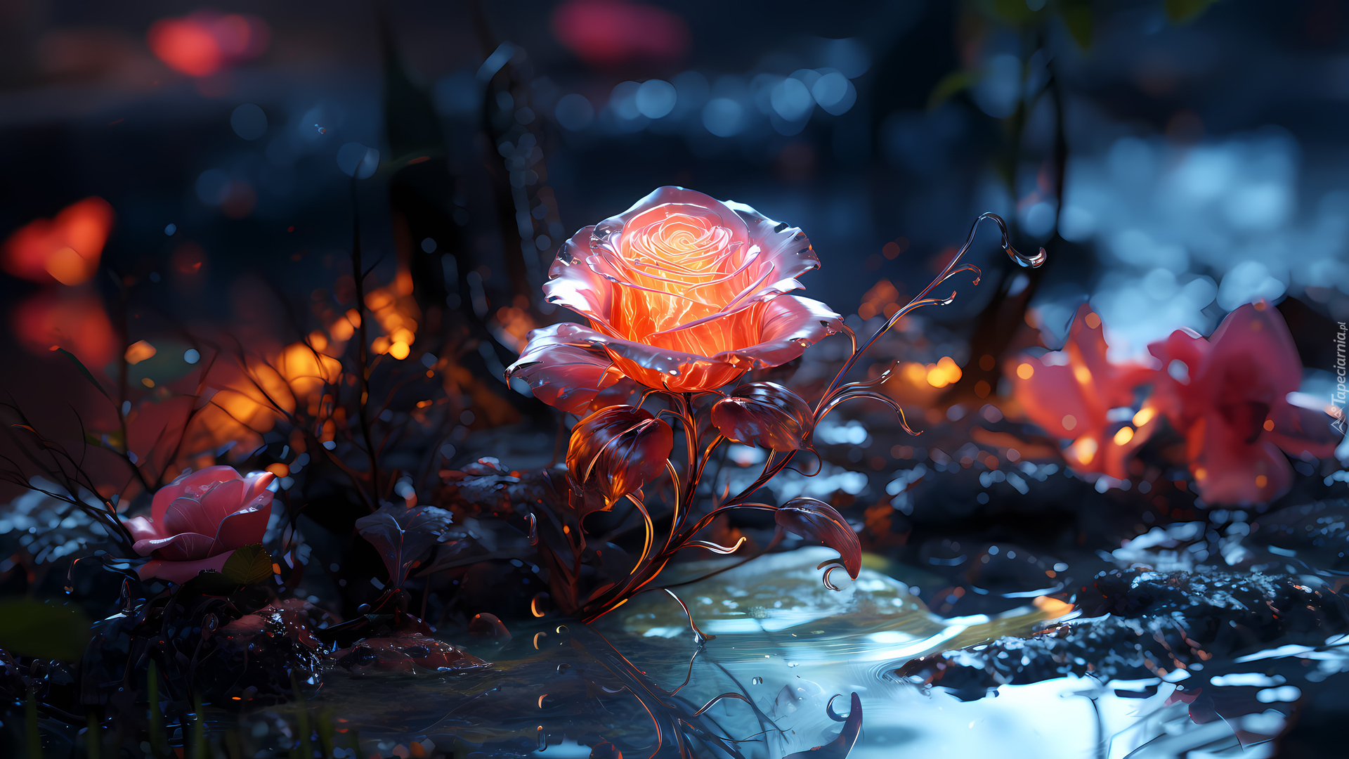 Edytor tapety: Rozświetlona szklana róża na rozmytym tle