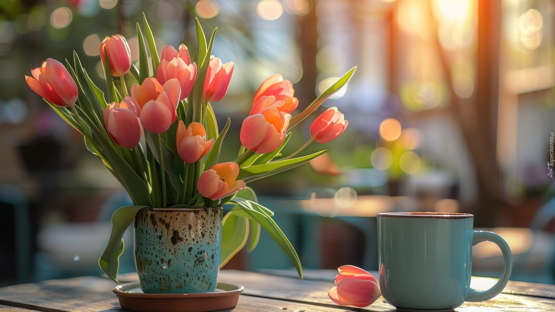 Edytor tapety: Kubek obok tulipanów w wazonie na stole