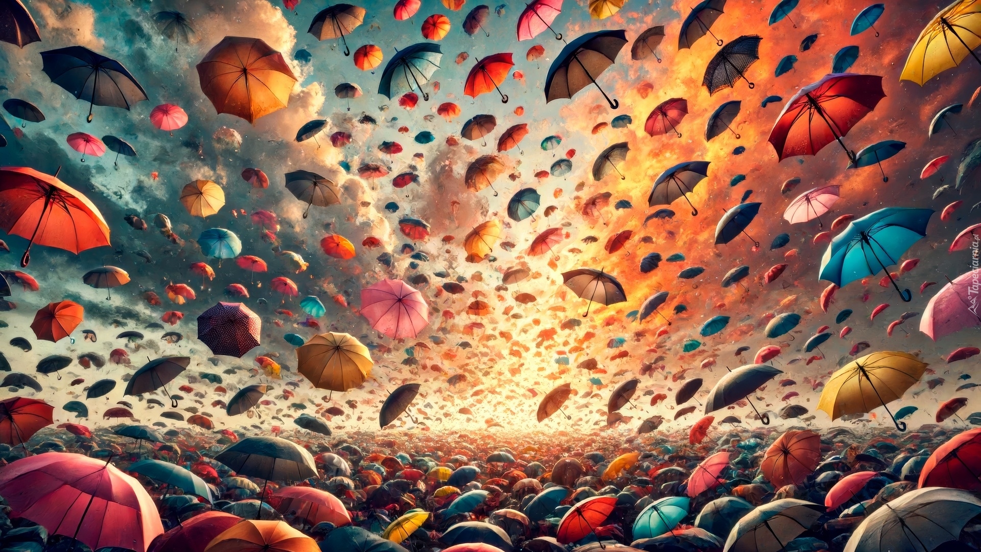 Edytor tapety: Latające kolorowe parasolki w grafice