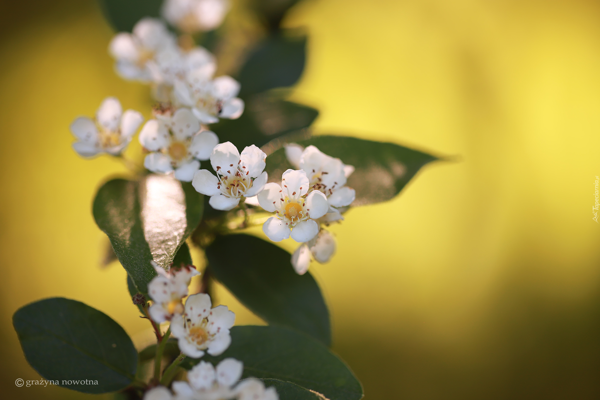 Edytor tapety: Gałązka z białymi kwiatuszkami na rozmytym tle