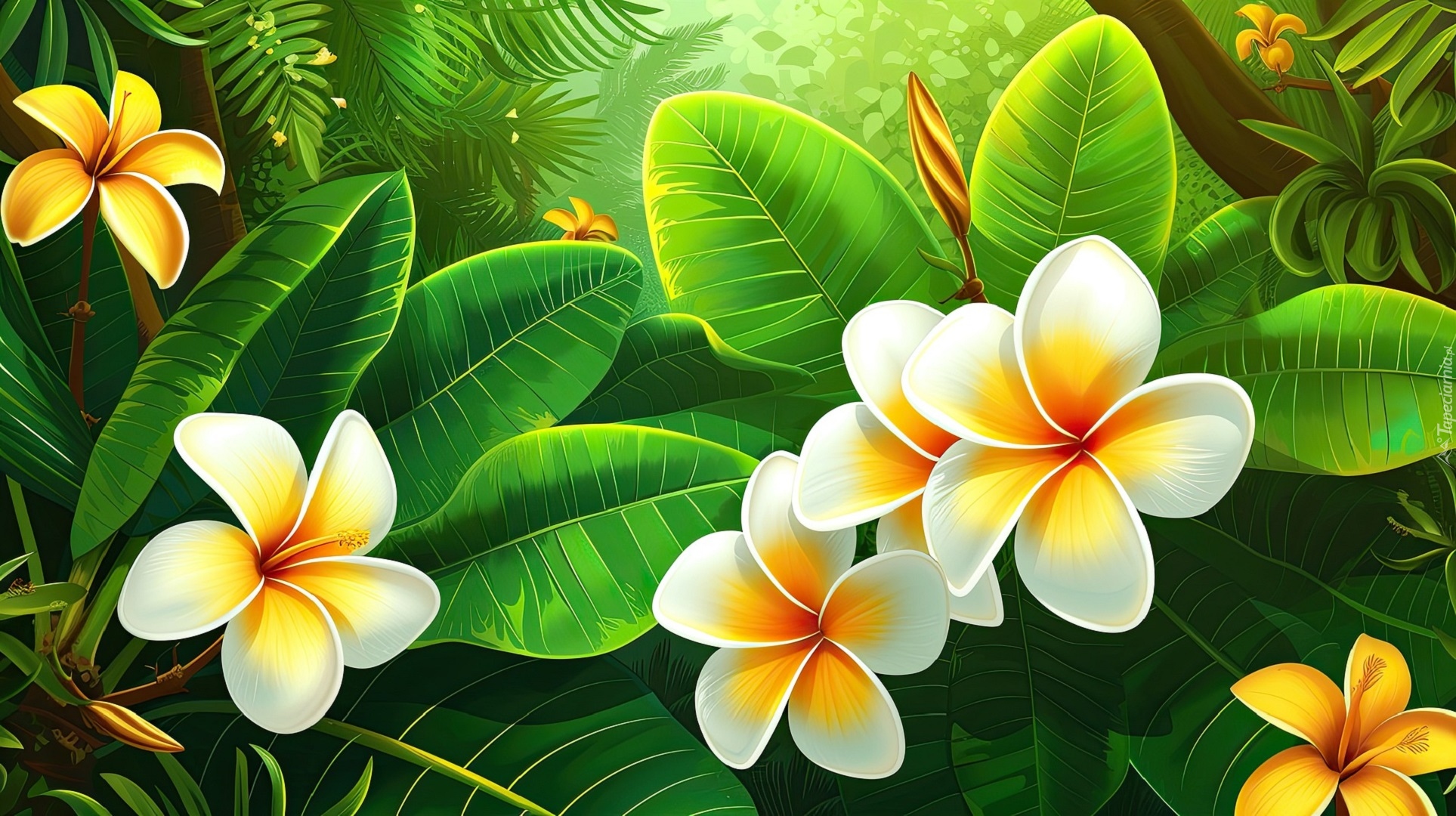 Edytor tapety: Białe i żółte plumerie na liściach