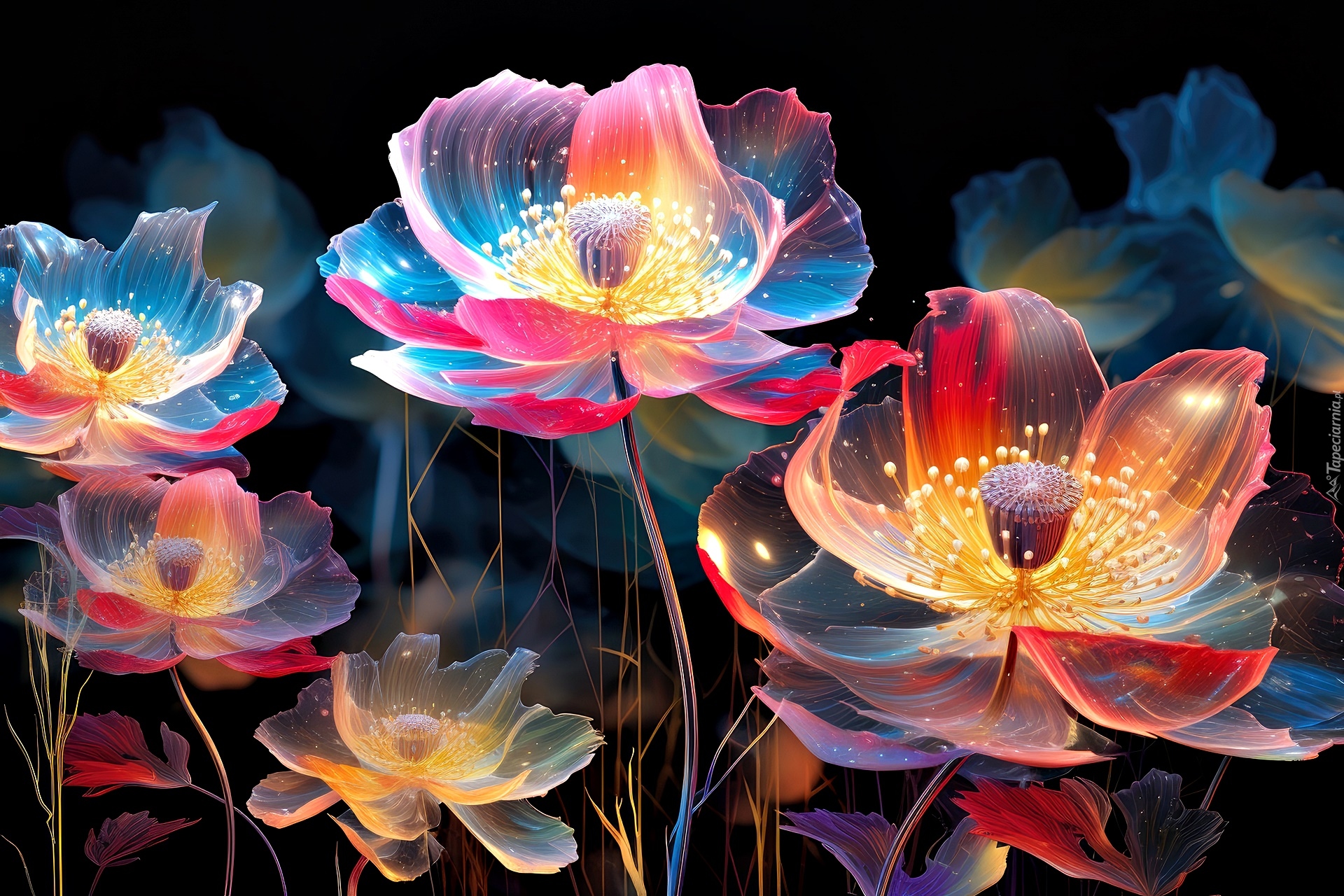 Edytor tapety: Kolorowe graficzne lotosy na czarnym tle