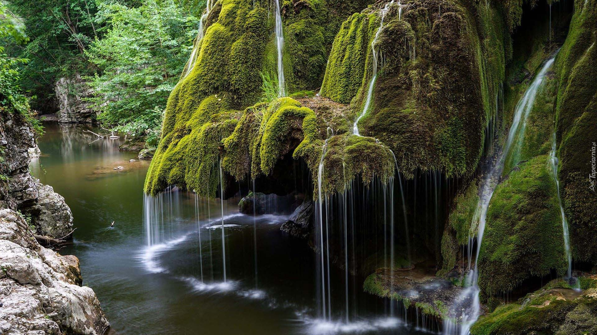 Edytor tapety: Bigar Cascade Falls na omszałych skałach w Rumunii