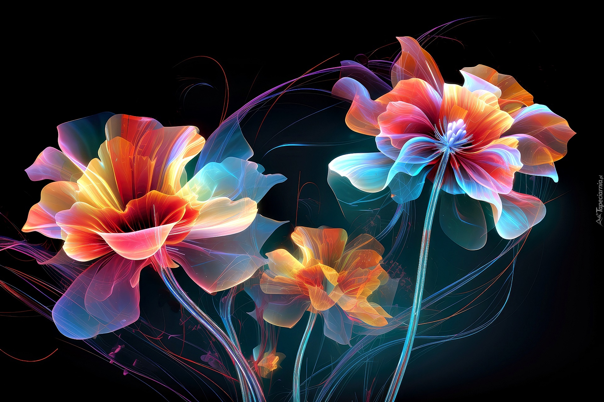 Edytor tapety: Trzy kolorowe kwiaty na ciemnym tle