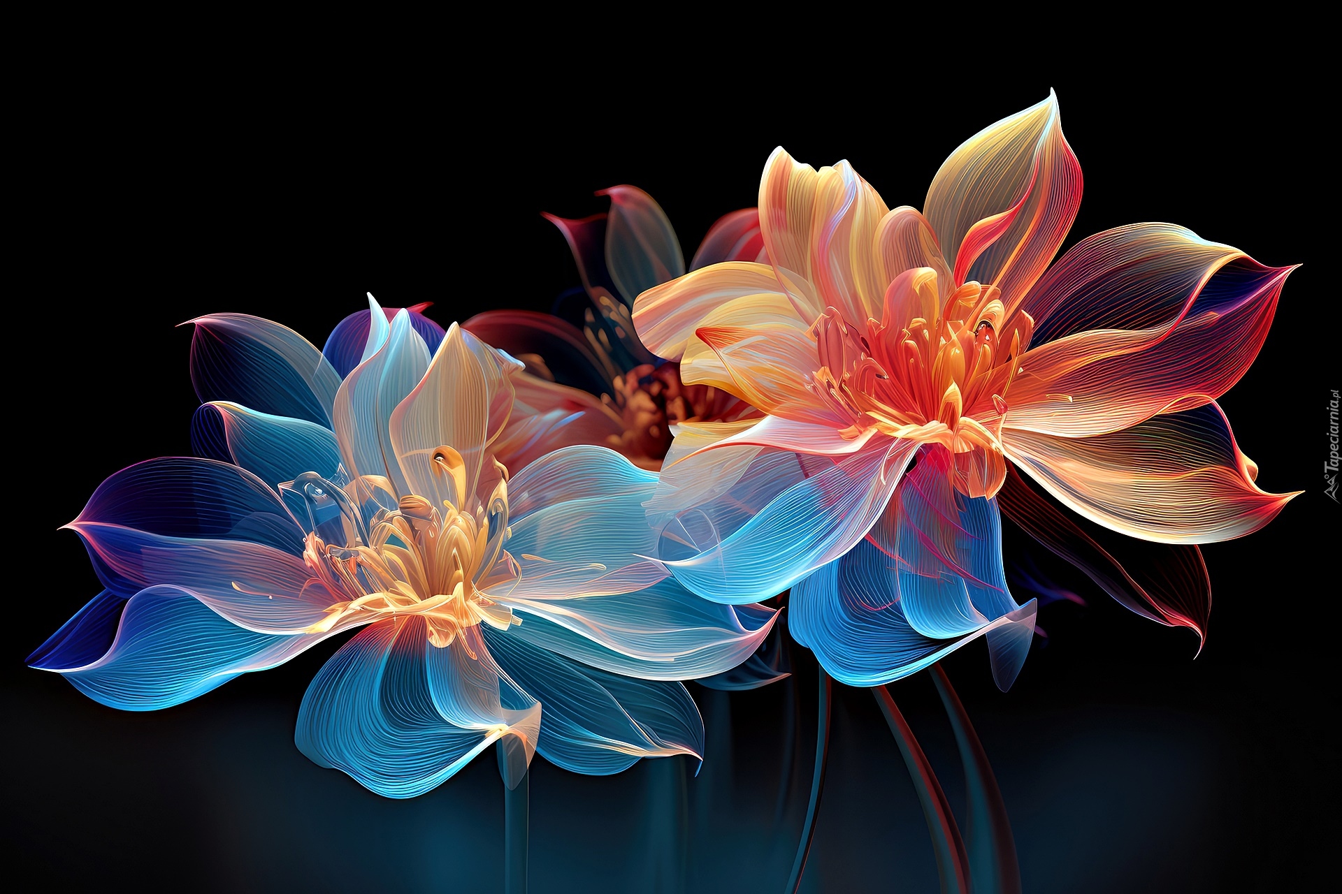 Edytor tapety: Dwa kolorowe kwiaty na czarnym tle w grafice