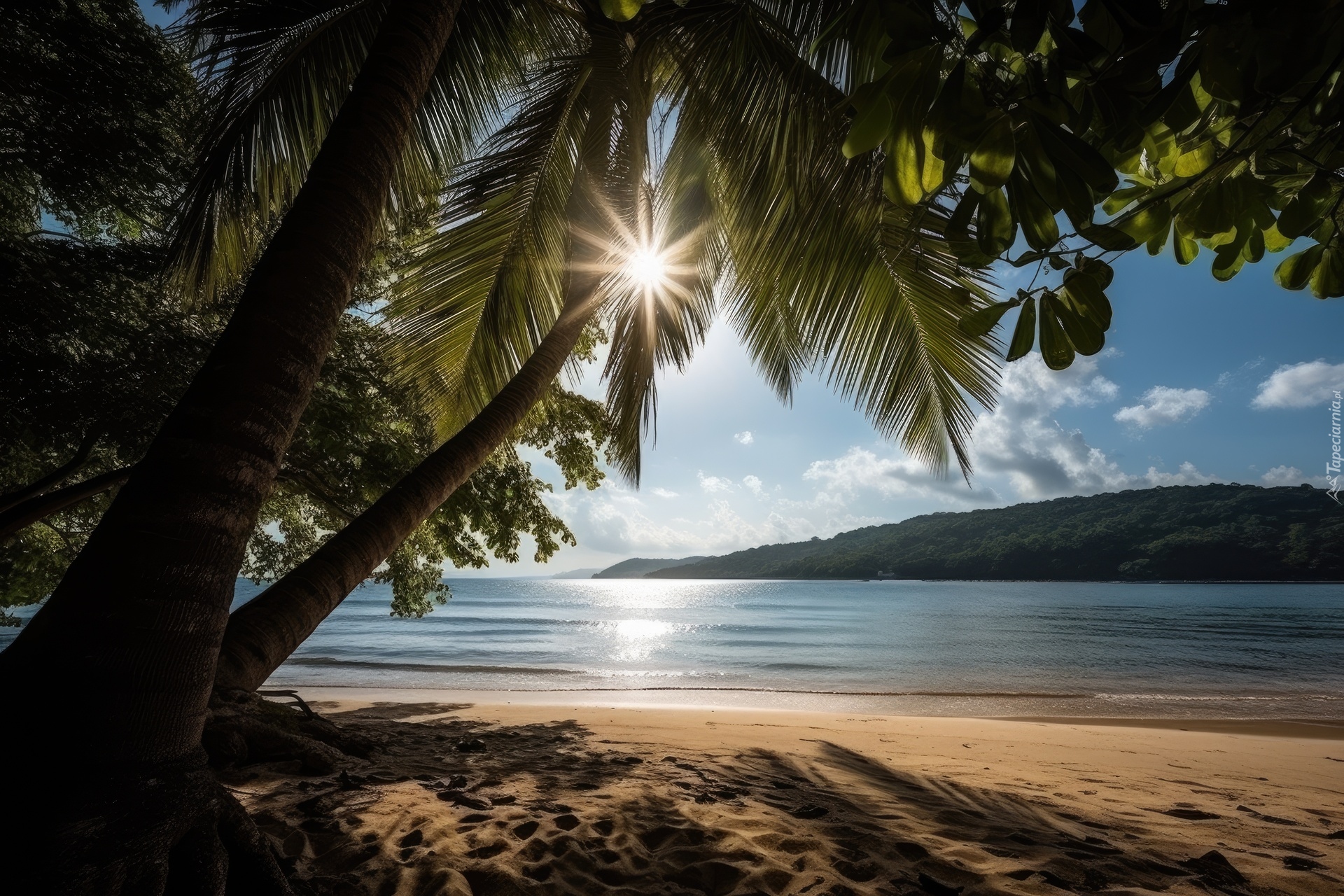 Edytor tapety: Promienie słońca między liśćmi palmy na plaży